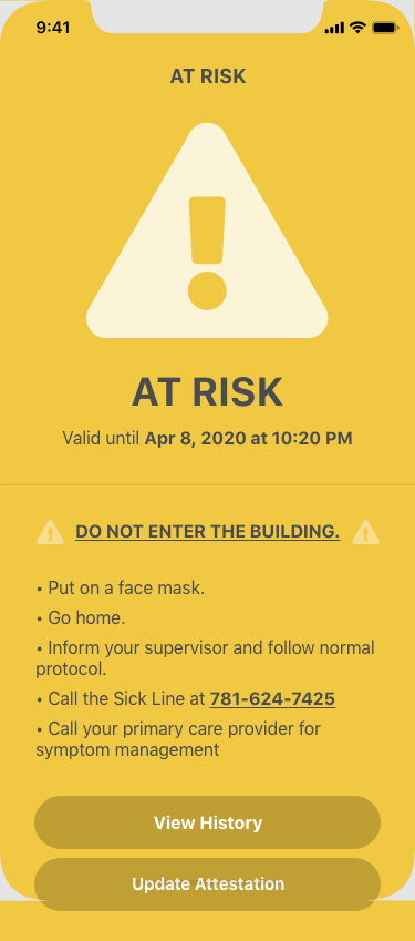 A native mobile app that allows employees enter a daily attestation statement. These statements will change the app into a 'badge' page (Clear [Green], Risk [Yellow], Alert [Red]). The app will also maintain a history of statements. The mobile app will use the companies Active Directory or external authentication service. We intend to use AWS Cognito's Federated services to make the solution accessible to many authentication services.