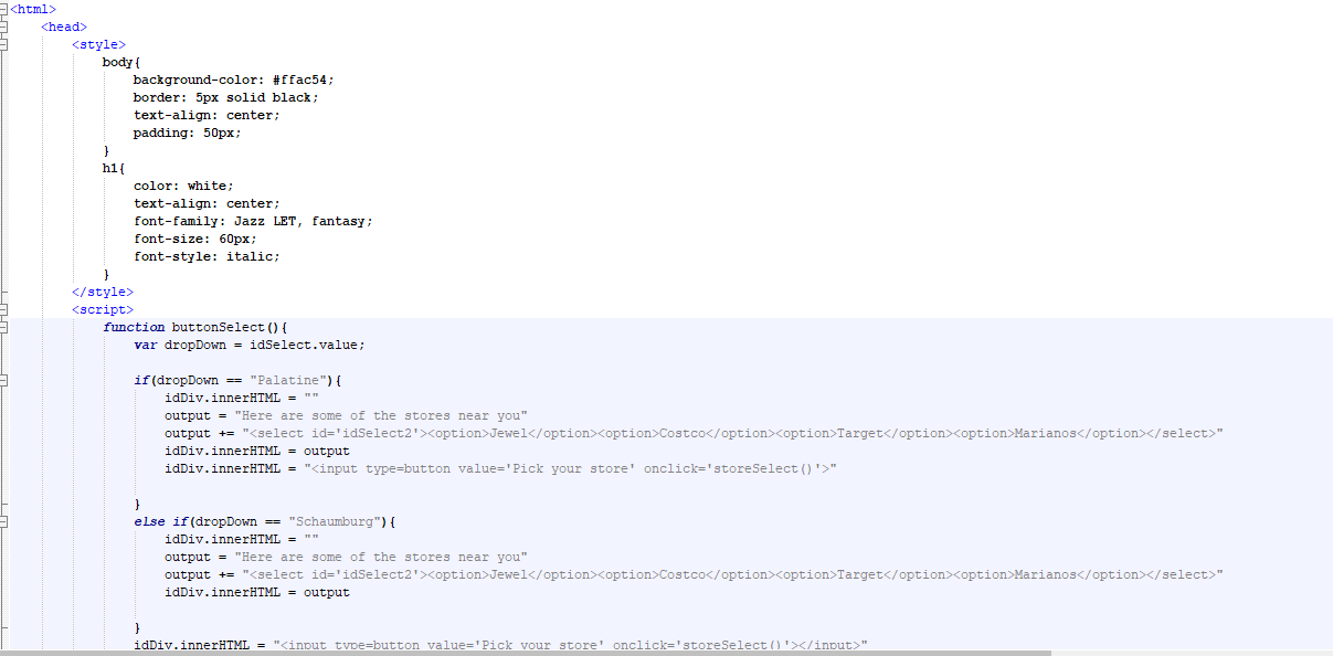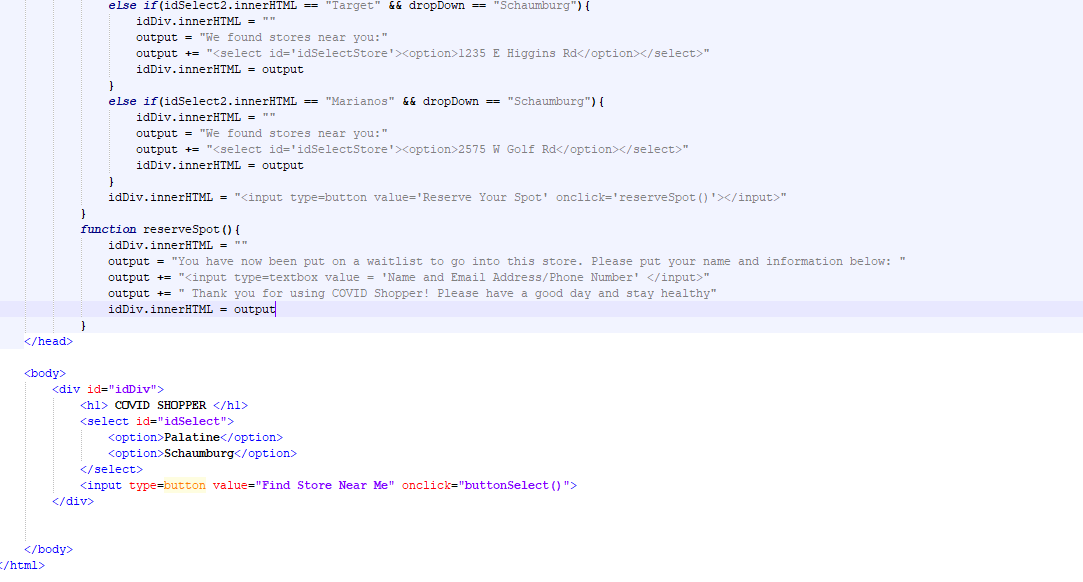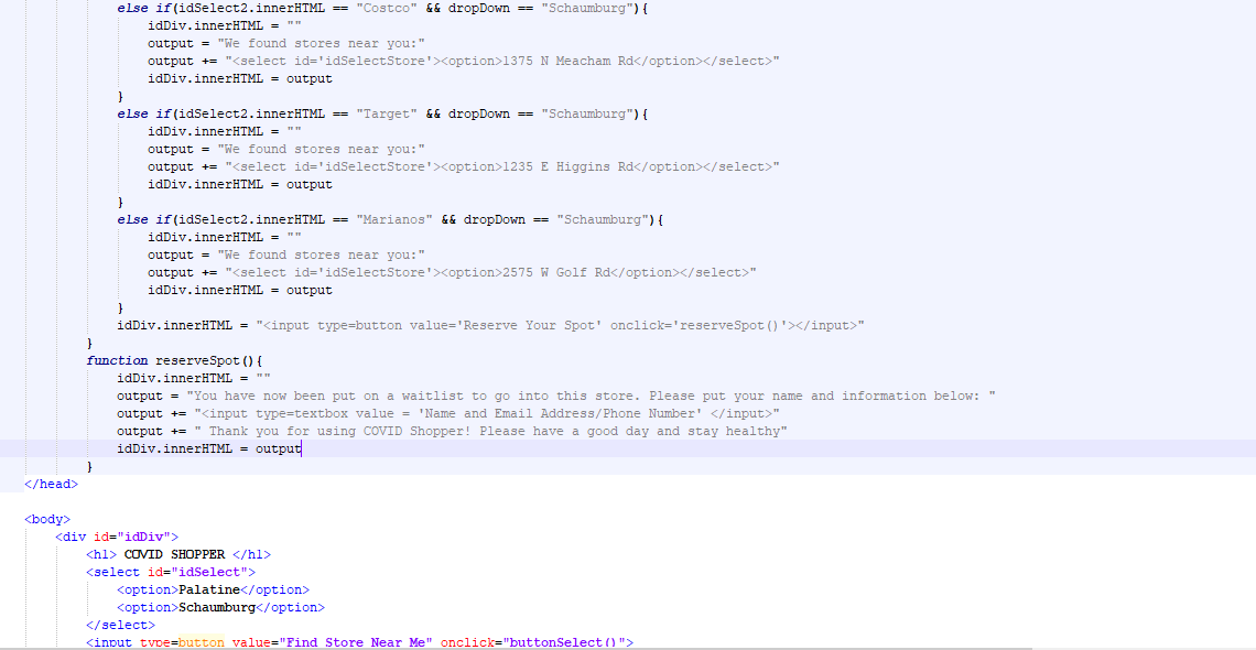 I built it using JavaScript. It is currently not a running program, but it depicts how the user will be forced to put in their location, and then what store they are trying to shop at. Then once they find the shop that they want to go to, it will put their name on a list and allow them to go shopping once it is their turn.