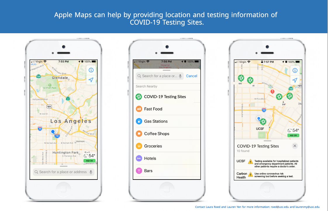 With drive-thru testing sites for COVID-19 rolling out all over the country, we propose that Google Maps, Apple Maps, or any Maps App adds a feature to its application that shows where COVID-19 Testing Sites are located. Many people are falling ill, but do not know where to go to get tested since kits are limited. If the App could direct people to these locations, COVID-19 could be better contained and save thousands of lives. We designed a mock-up using the Google Maps and Apple Maps phone applications.