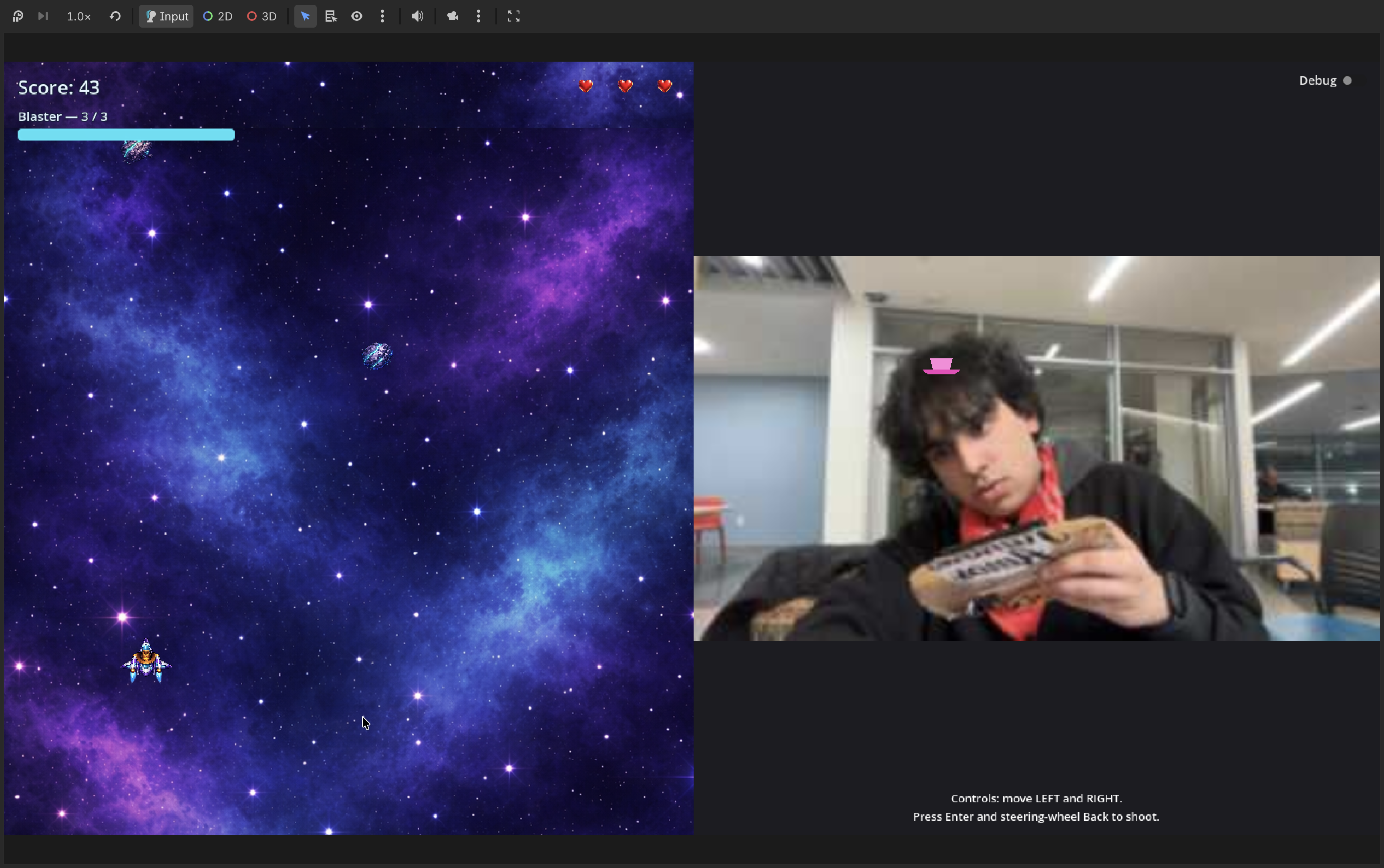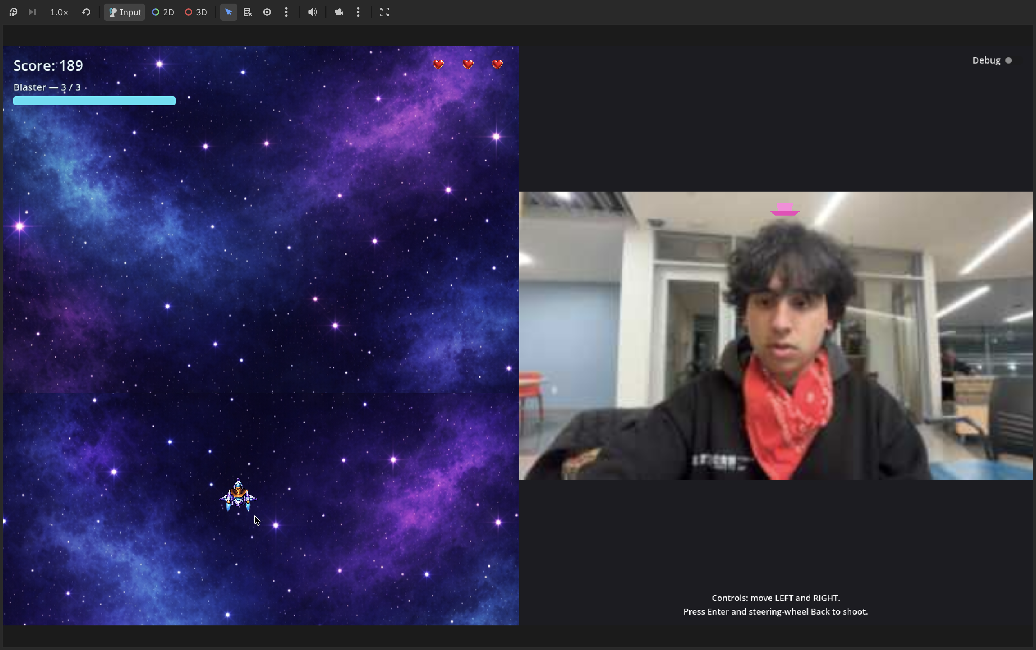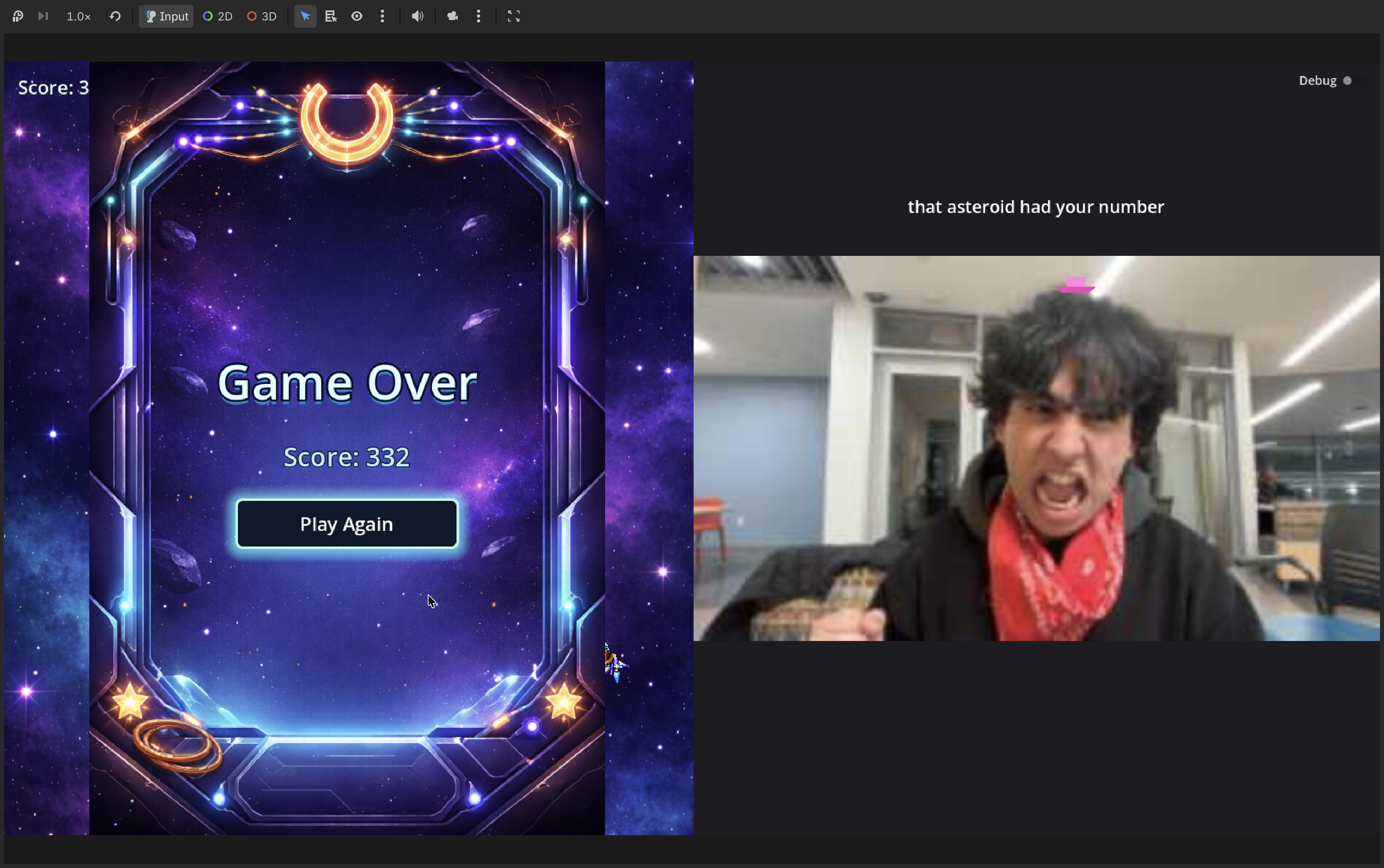 We used the Godot game engine (the GDScript language) to create the background, object models, and animations (spaceships and asteroids). We also used GDScript for the game's logic (ex. controlling the spaceship model based on the person's position). For facial landmark detection (detecting a person's forehead), we utilized Mediapipe, which uses different models for facial detection, including Google's Gemini API.