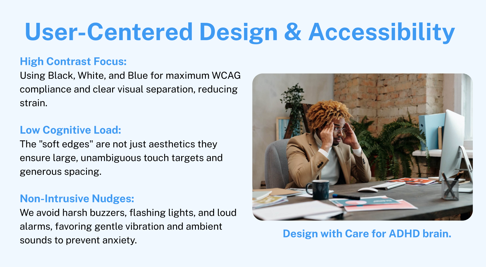 We learned how crucial instant feedback, low-pressure design, and emotional safety are for ADHD users. We also deepened our understanding of kawaii aesthetics and accessibility principles.