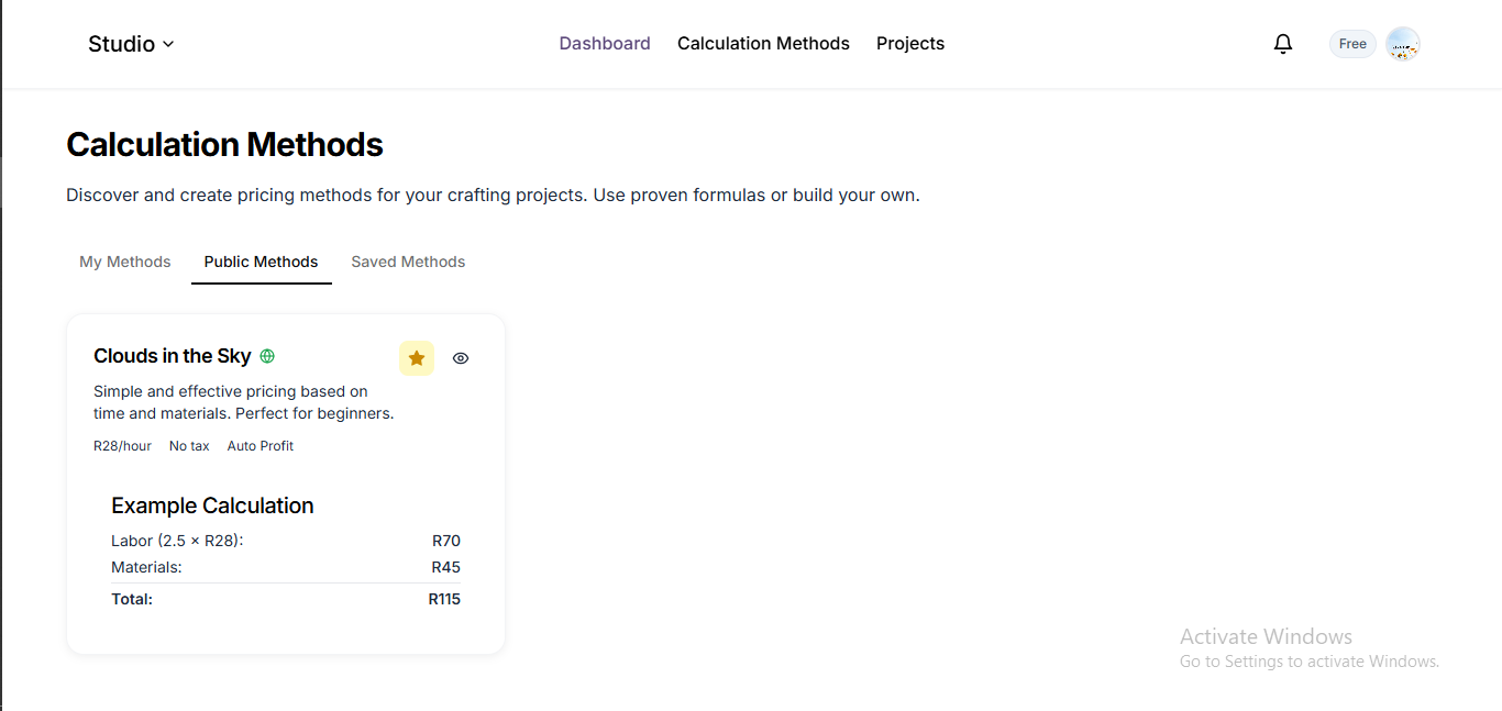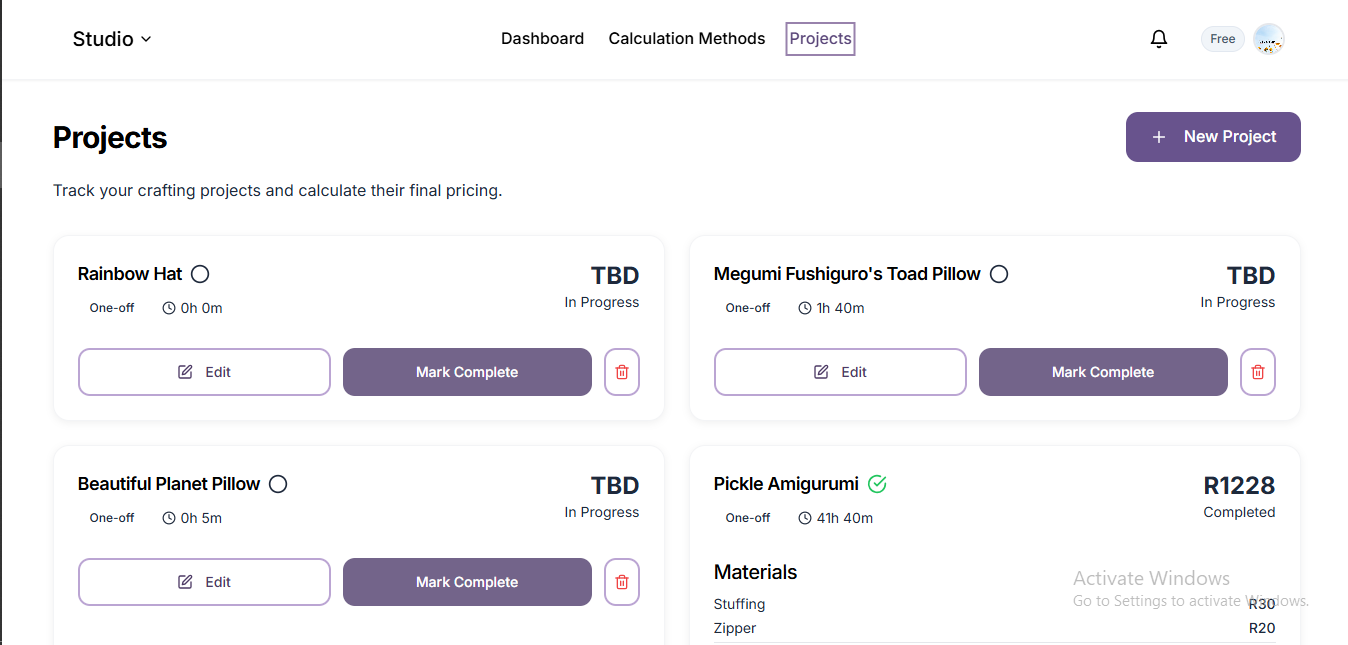 Cralaxia Studio is a project tracker and calculator. Users can log their time, build project histories, and use customizable pricing methods (their own or from others) to calculate fair and thoughtful prices for their handmade products.