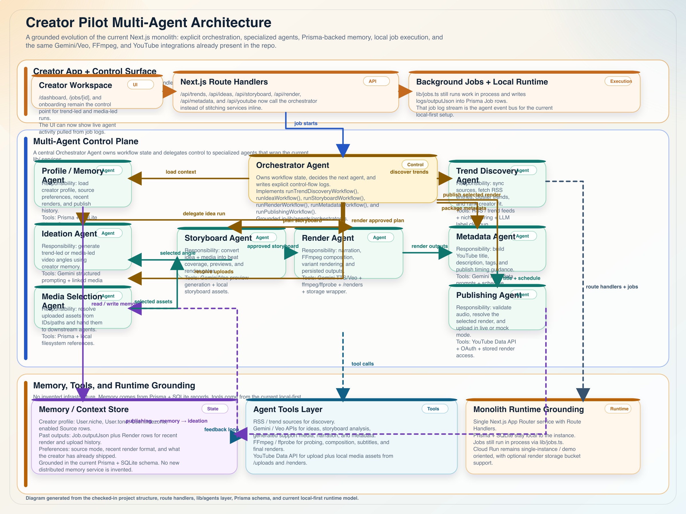CreatorPilot is now a local-first single-instance prototype with explicit orchestration, specialized agents, creator memory, persisted render outputs, and visible agent-level workflow logging. The current implementation is intentionally monolithic and demo-oriented, which makes it practical for rapid iteration and hackathon presentation. Logical next steps include:
