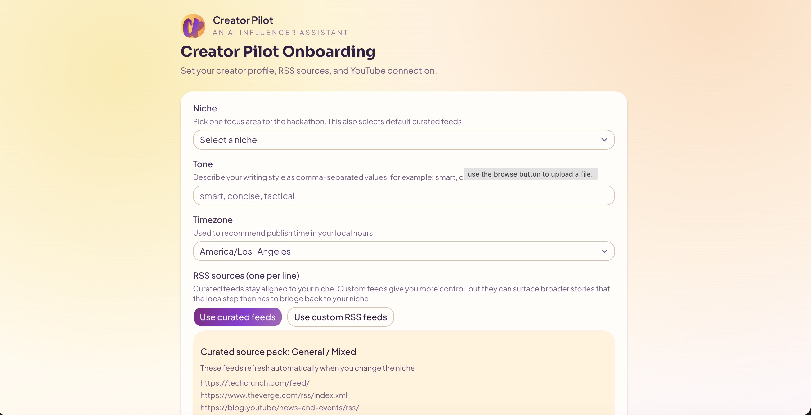 - Profile / Memory Agent: loads creator profile data and history from Prisma-backed local storage.