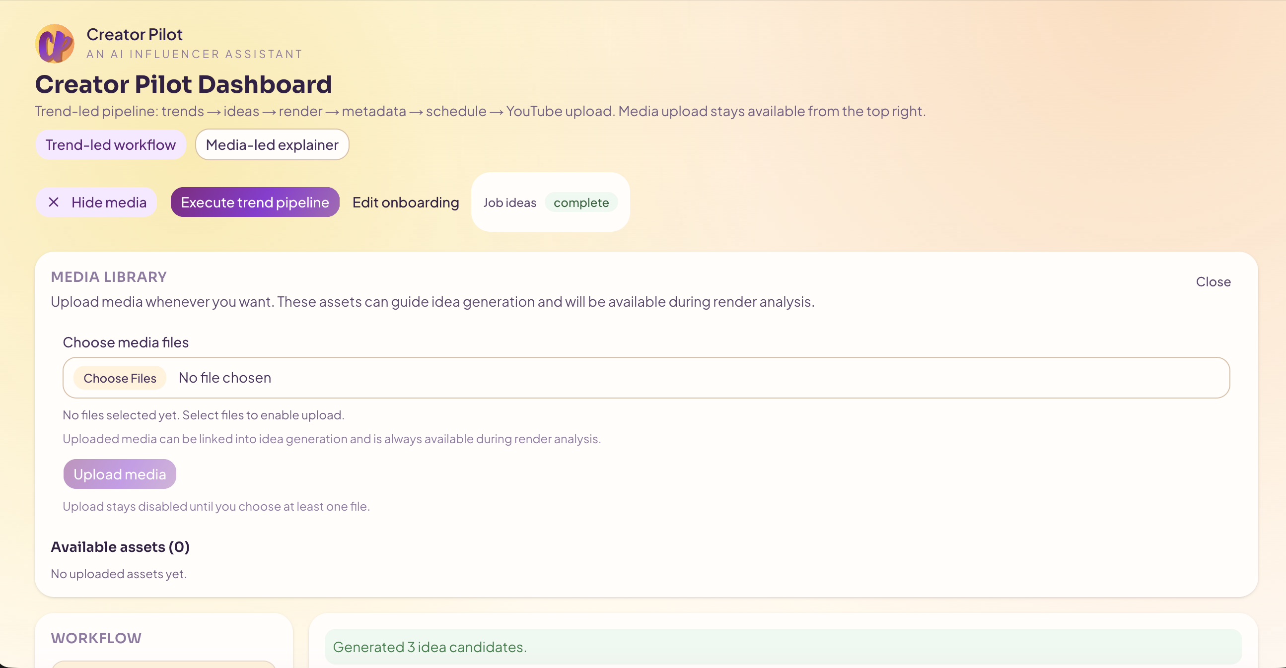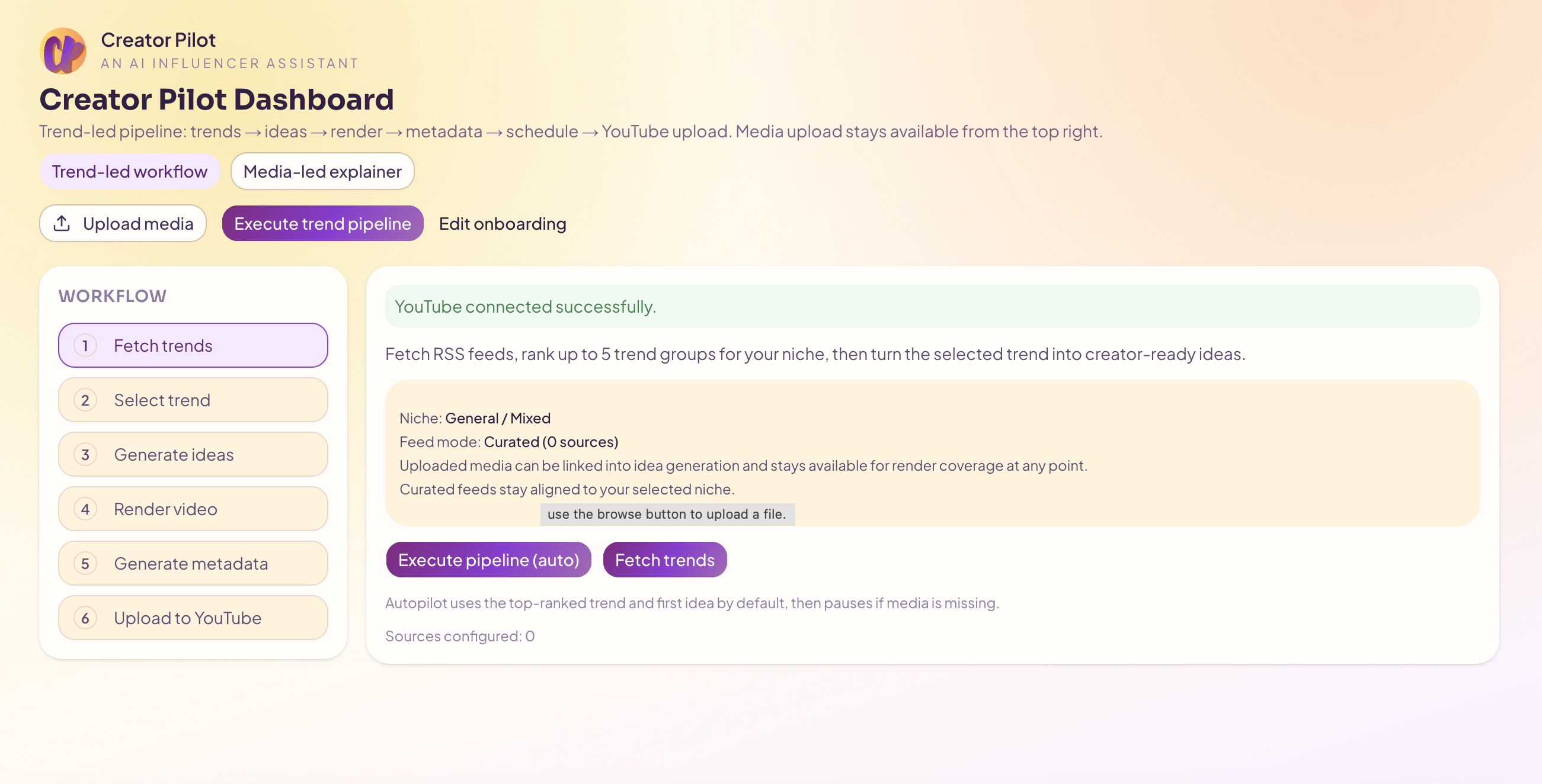 CreatorPilot is a modular multi-agent pipeline implemented inside a Next.js monolith (no external orchestration infrastructure).