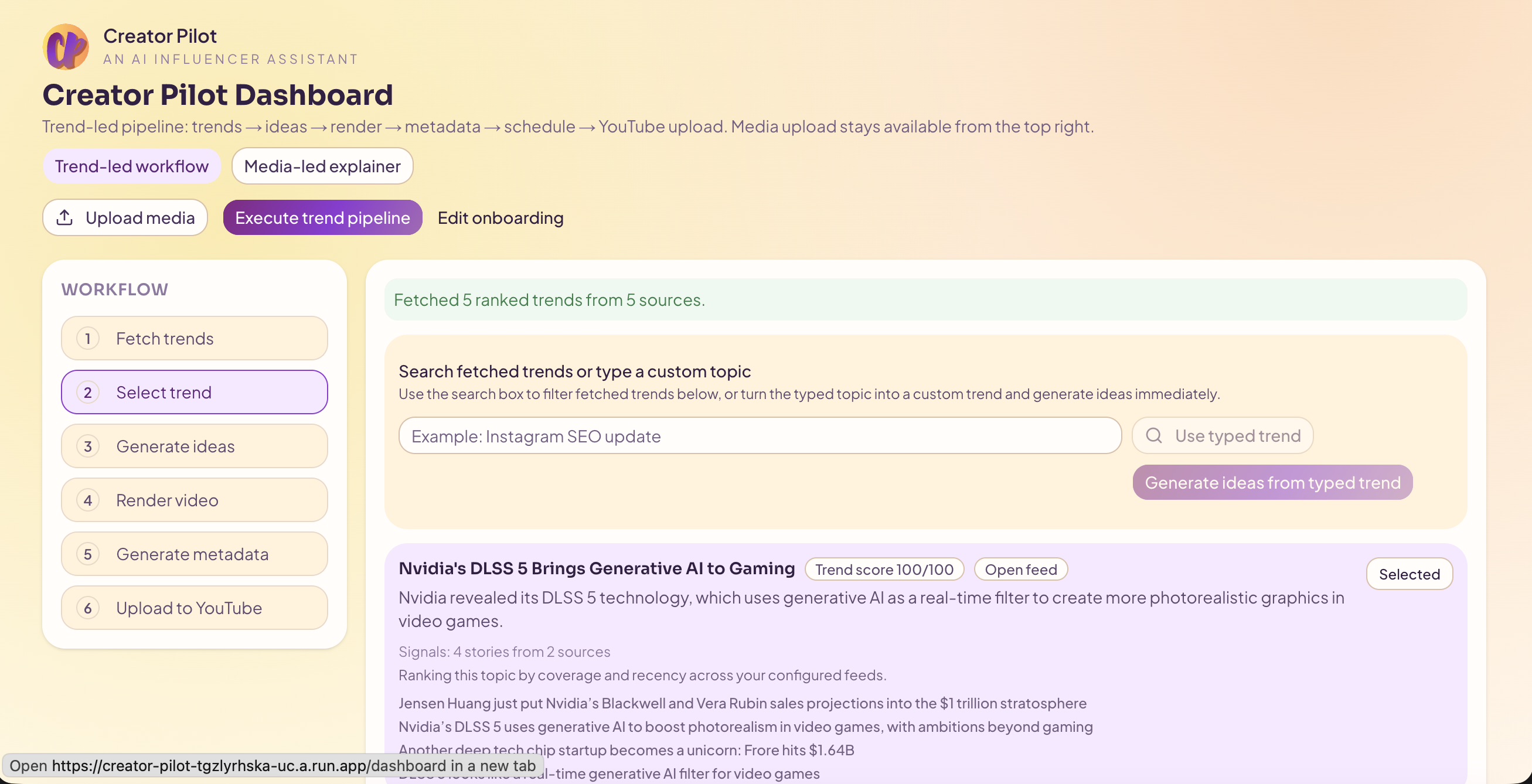 - Trend Discovery Agent: syncs enabled sources, fetches RSS entries, clusters related trends, and ranks them for creator fit.