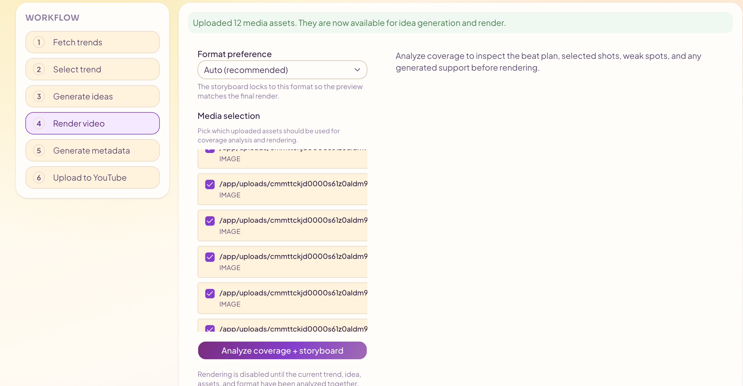 - Publishing Agent: validates the selected render, checks readiness for upload, and performs live or mock YouTube publishing.