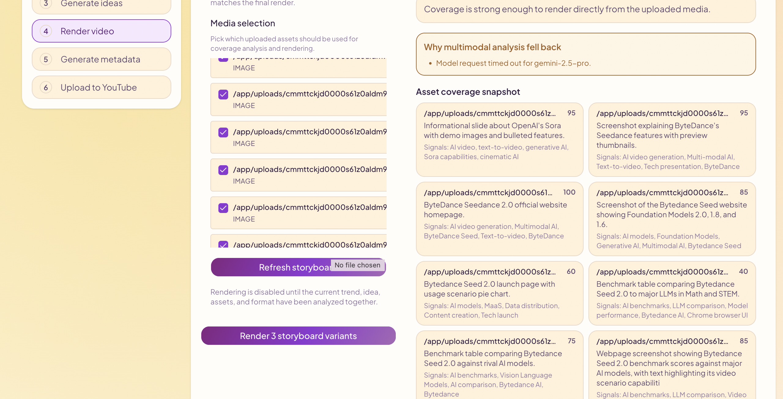 - Media Selection Agent: resolves uploaded creator assets and prepares them for downstream planning and rendering.