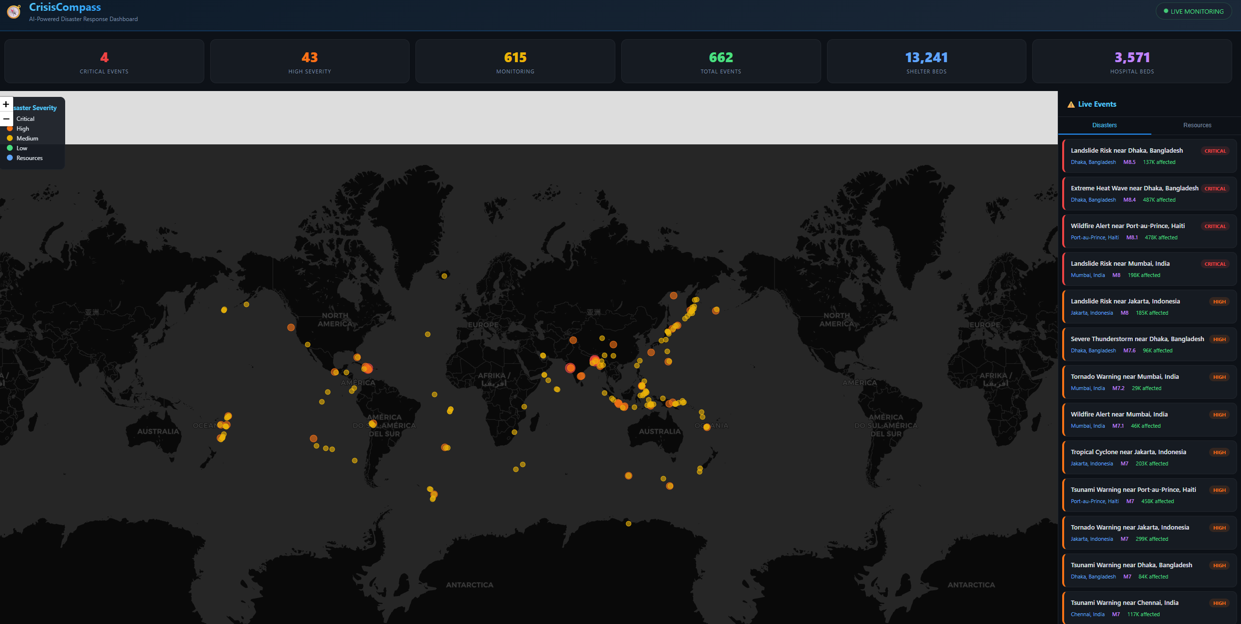 - Open data sources: USGS Earthquake API, OpenWeather, and synthetic resource datasets