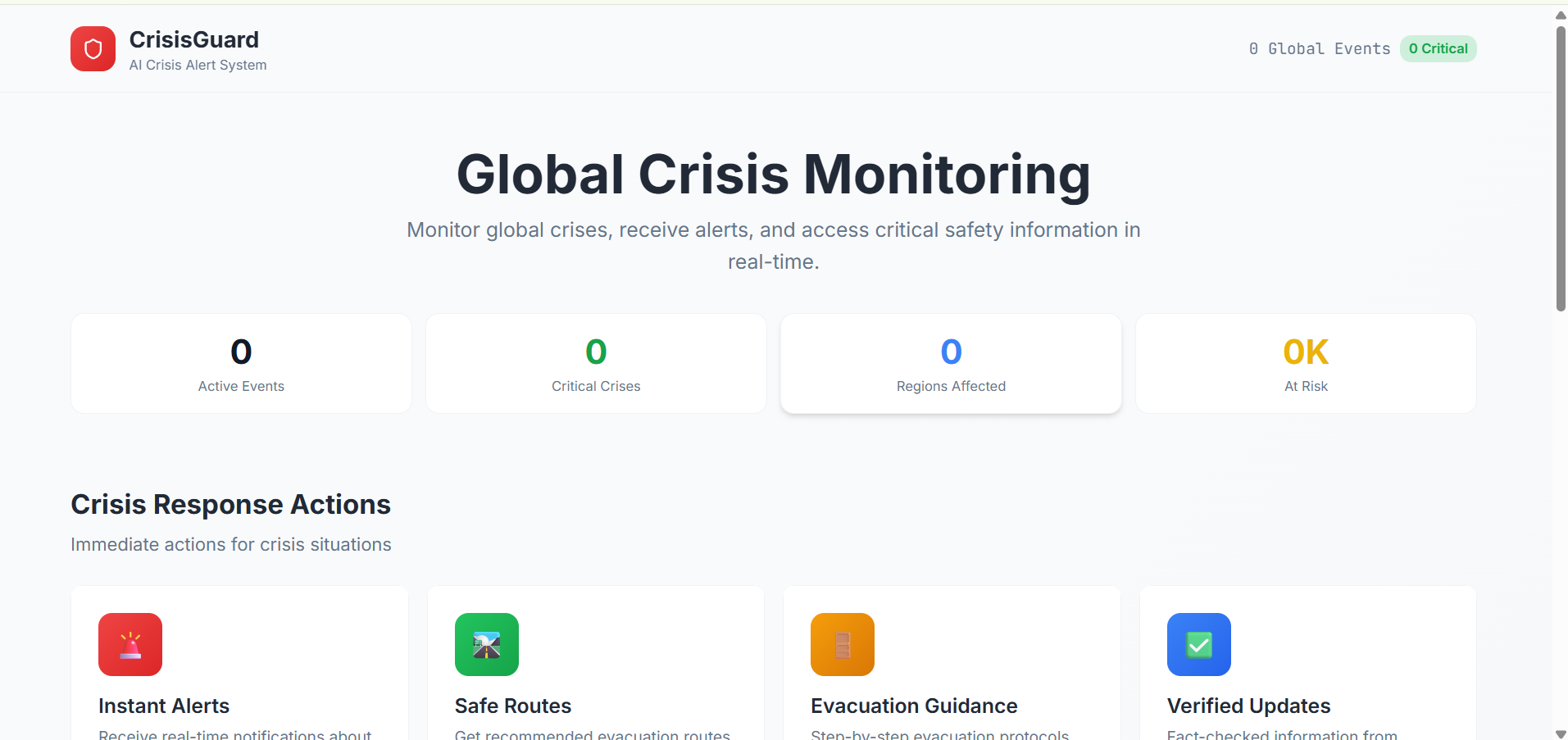 In many global crises—wars, terrorist attacks, natural disasters, or sudden conflicts—people often receive information too late. News channels take time to verify and broadcast events, and by the time warnings reach civilians, valuable time has already been lost. We wanted to build a system that detects danger faster than traditional news and alerts people instantly. CrisisGuard was inspired by the idea that early information can save lives. Travelers, journalists, humanitarian workers, and civilians all need real-time awareness of dangerous situations around them. Our goal was to create a platform that monitors global crisis signals and sends early alerts to users, helping them stay safe and make informed decisions.