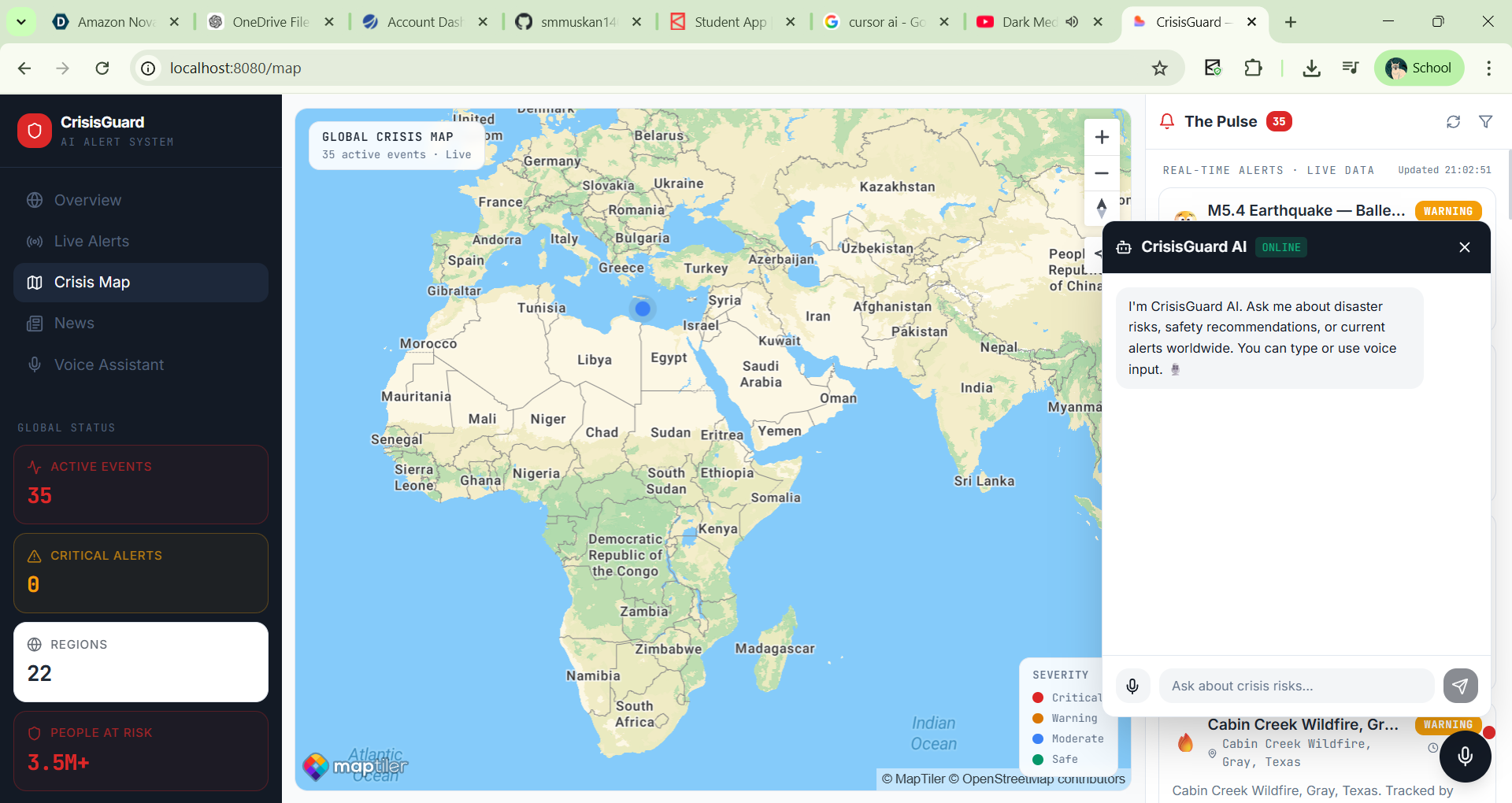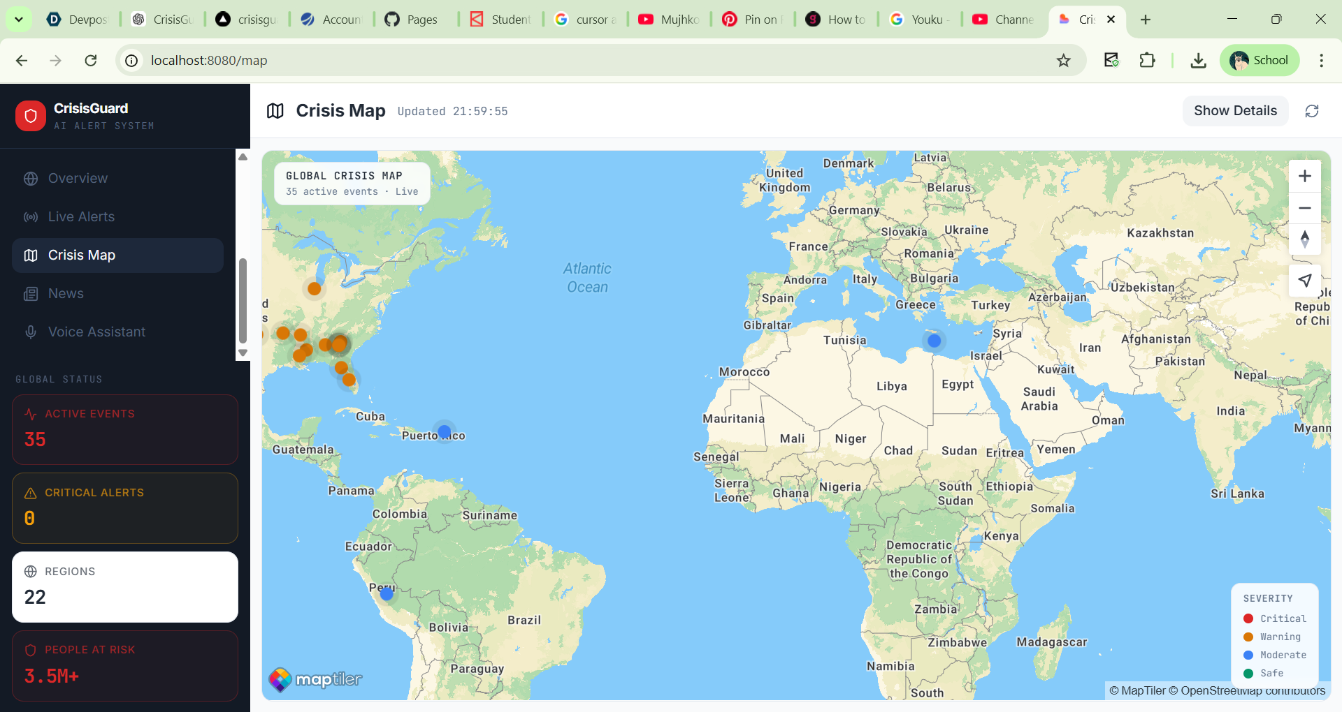 Building a working AI-powered crisis alert system Integrating real-time global data sources Creating a map-based visualization of crisis zones Designing a platform that could potentially help people stay safe during emergencies