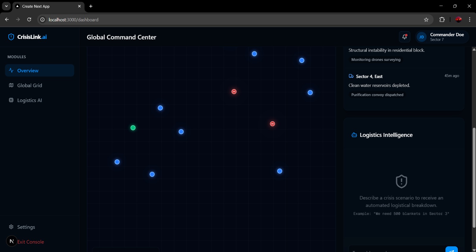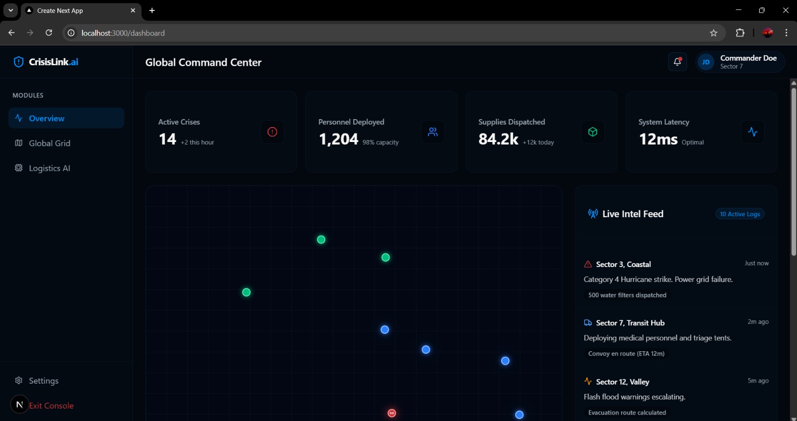 We architected CrisisLink using a highly scalable, modern edge-computing stack. The frontend command center is built on Next.js and React, utilizing Tailwind CSS and shadcn/ui to ensure the interface is highly legible and accessible even in high-stress, low-bandwidth environments.