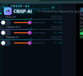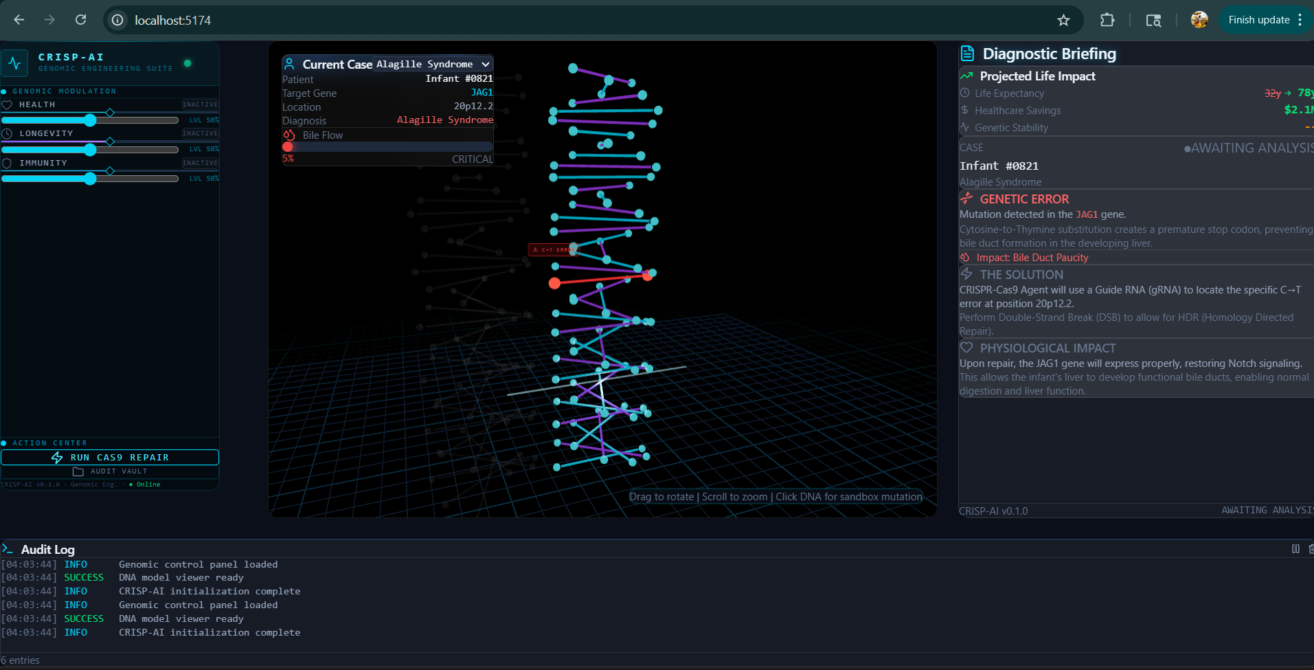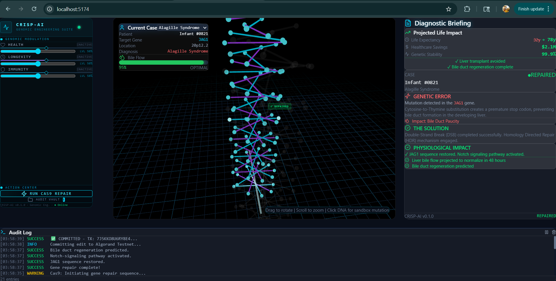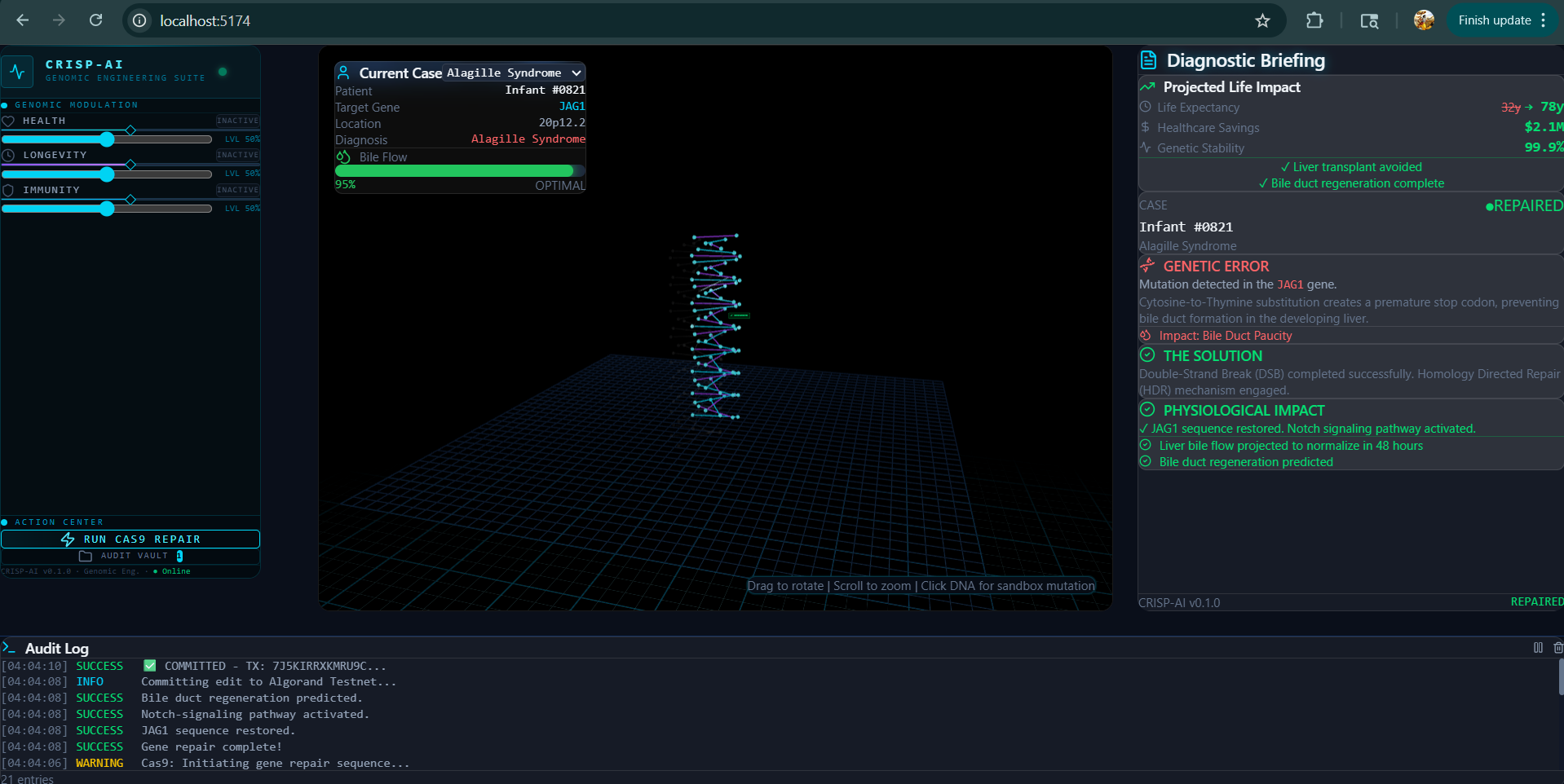CRISP-AI simulates a real CRISPR-Cas9 gene editing workflow on a live 3D DNA strand. It detects a Cytosine-to-Thymine mutation in the JAG1 gene (Alagille Syndrome), deploys an AI-powered Cas9 agent to repair it, and commits the verified edit to the Algorand blockchain — all visualized in real time.