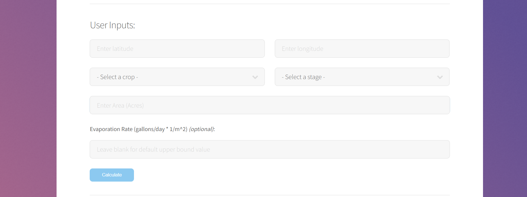 Our project estimates the minimum amount of water needed daily to grow a specified crop type, given coordinates, an area, and the stage of growth the crop is at.