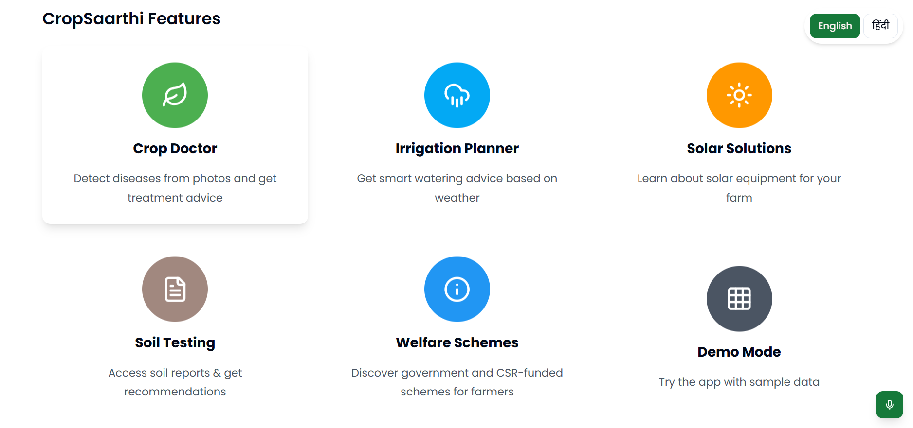 CropSaarthi is a mobile-first AI assistant designed for farmers. It provides: