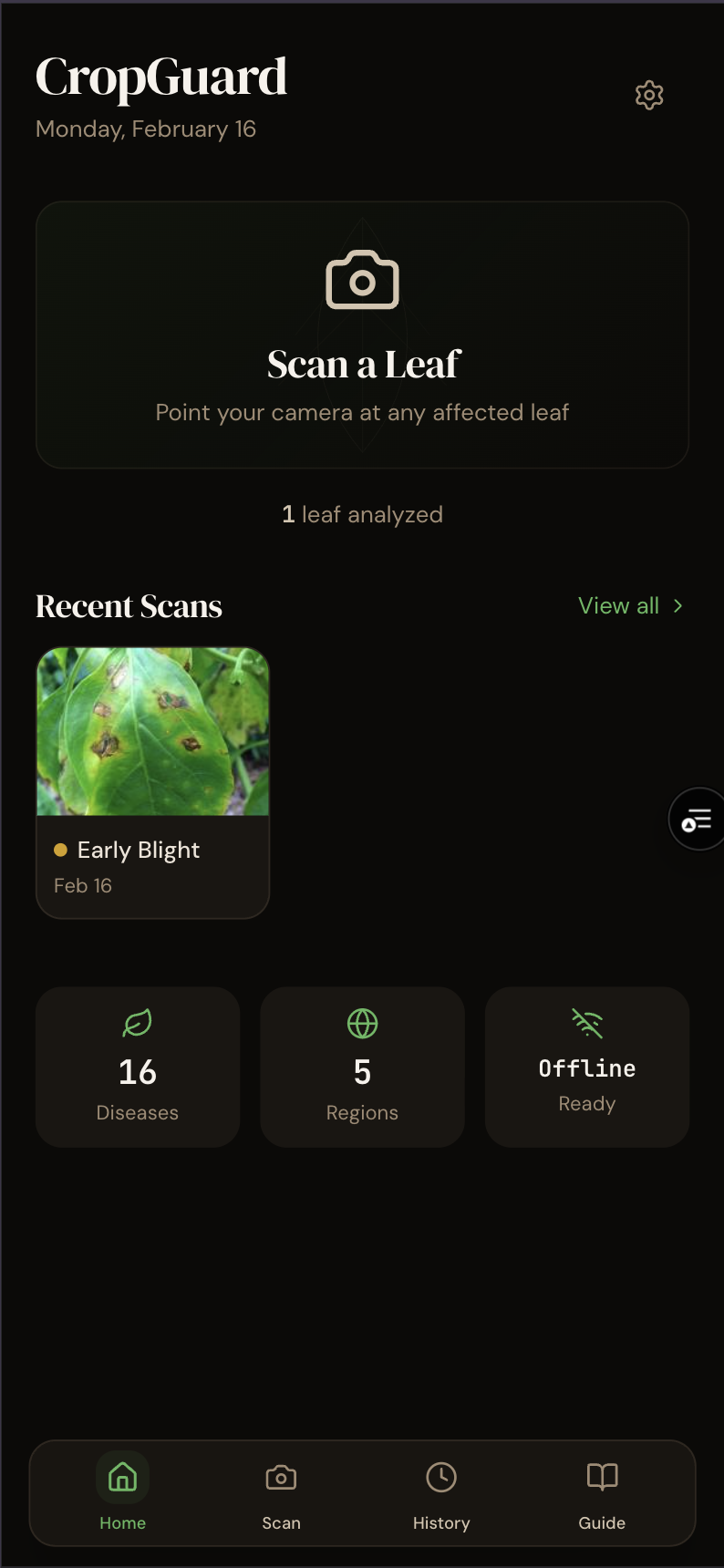 CropGuard AI is a Progressive Web App (PWA) that uses advanced computer vision to diagnose crop diseases.