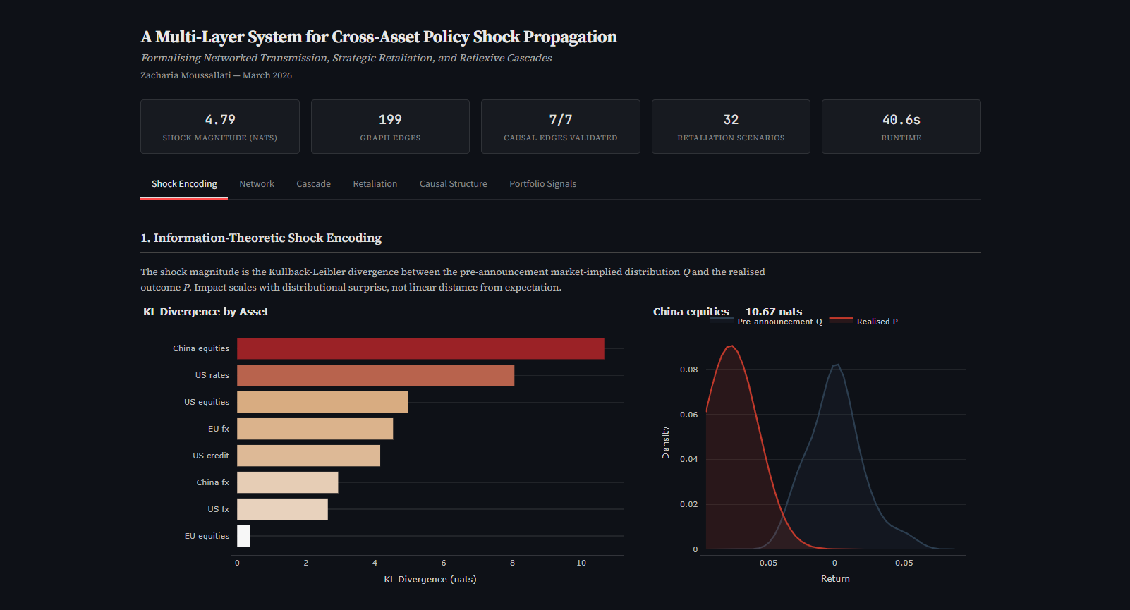 The system ingests a policy shock and models cross-asset propagation as a network problem. Four integrated components run end-to-end: