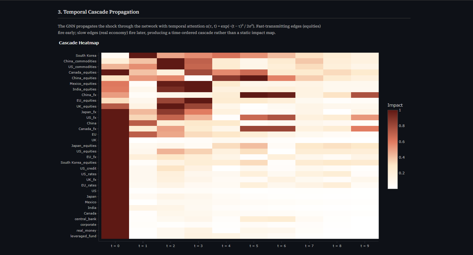 The full source code is available on our GitHub. Clone the repo, install dependencies, and launch the Streamlit demo to explore the system interactively. For the most comprehensive results, max out the cascade timesteps and shock multiplier, and select all available countries in the retaliation panel.