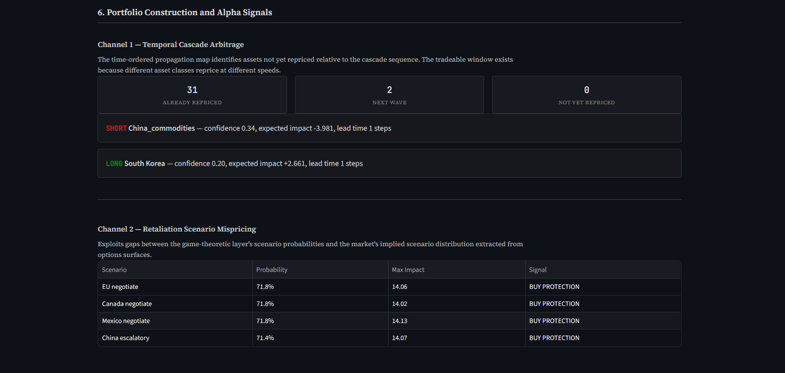 The system generates three alpha channels: temporal cascade arbitrage (position before the cascade reaches later-order assets), retaliation scenario mispricing (exploit gaps between system and market-implied scenario probabilities), and reflexivity positioning (trade the market-policy feedback loop when the Lipschitz constant approaches 1).