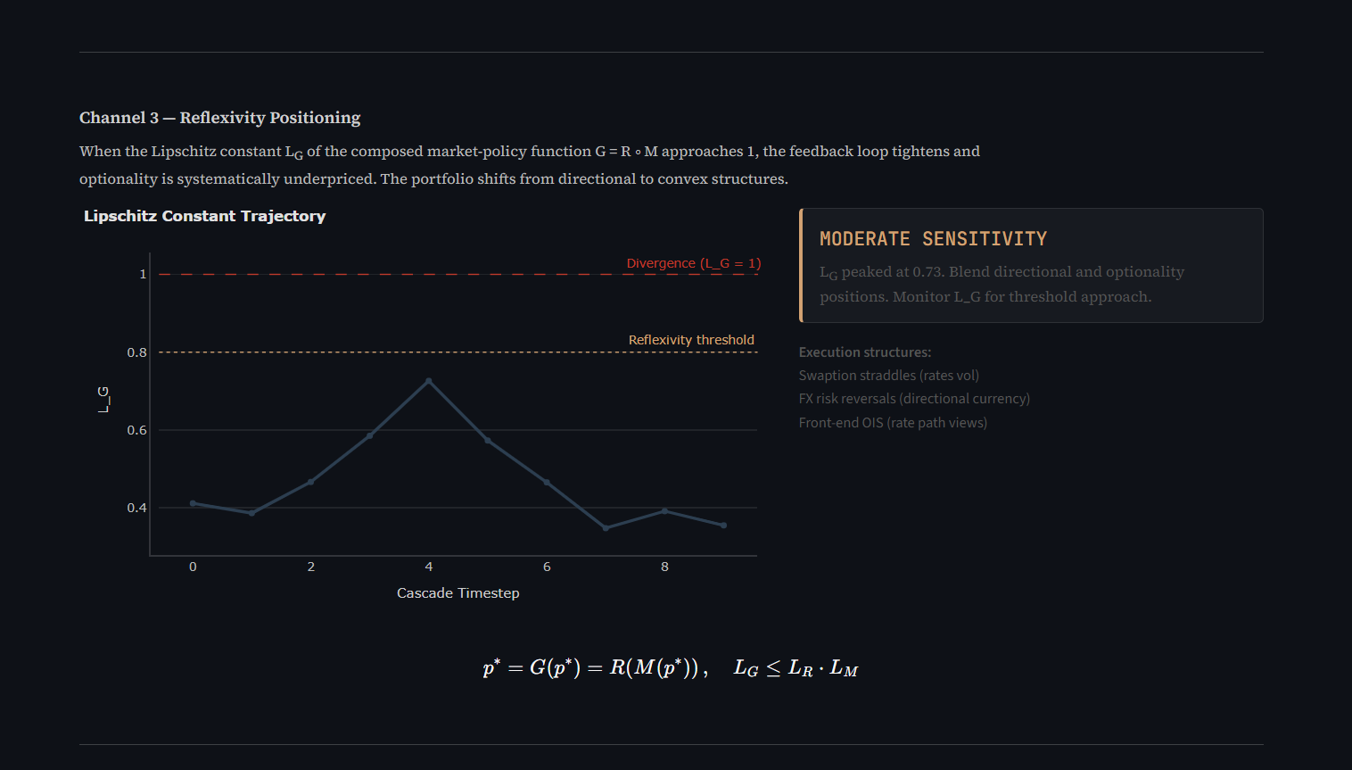 Reflexivity Fixed-Point Iteration — formalising the market-policy feedback loop as a Banach contraction mapping with analytically characterisable convergence properties. The Lipschitz constant serves as a real-time instability signal.