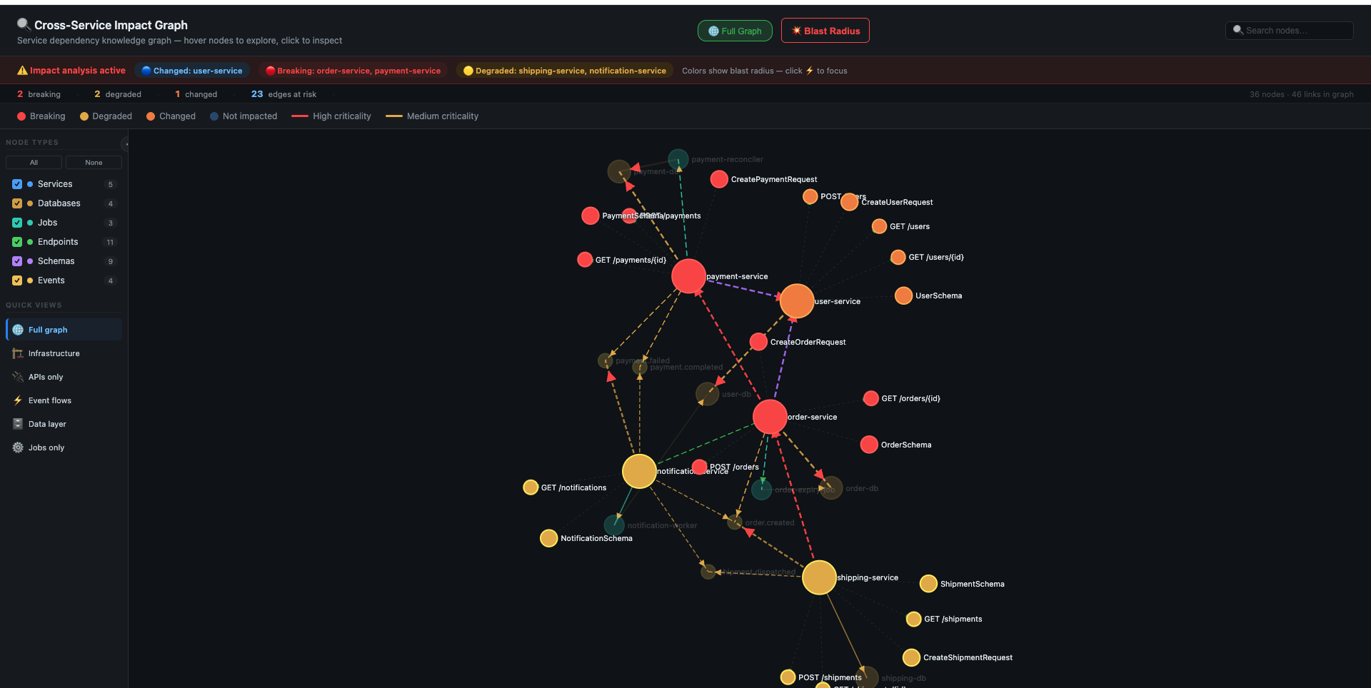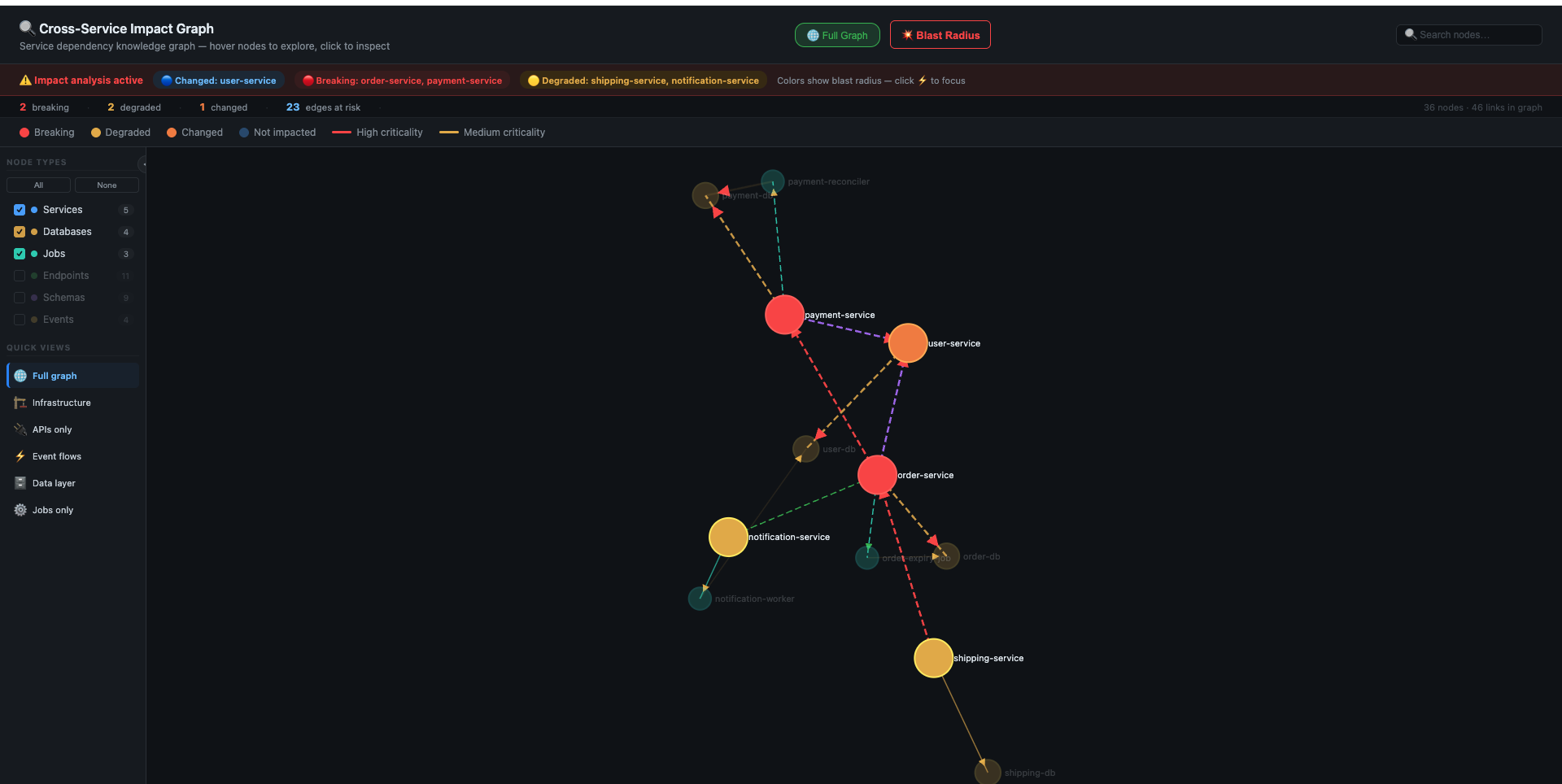 | 📊 SLA-aware impact scoring | Weight blast radius by service SLA and criticality — breaking a 99.99% service scores higher than breaking an internal tool |
