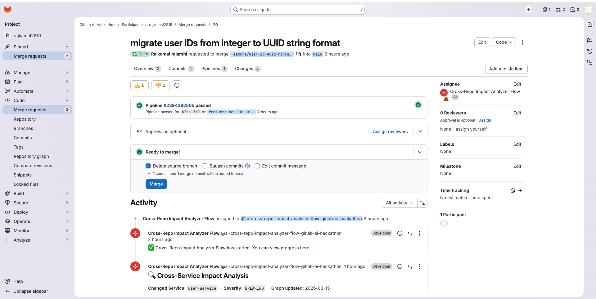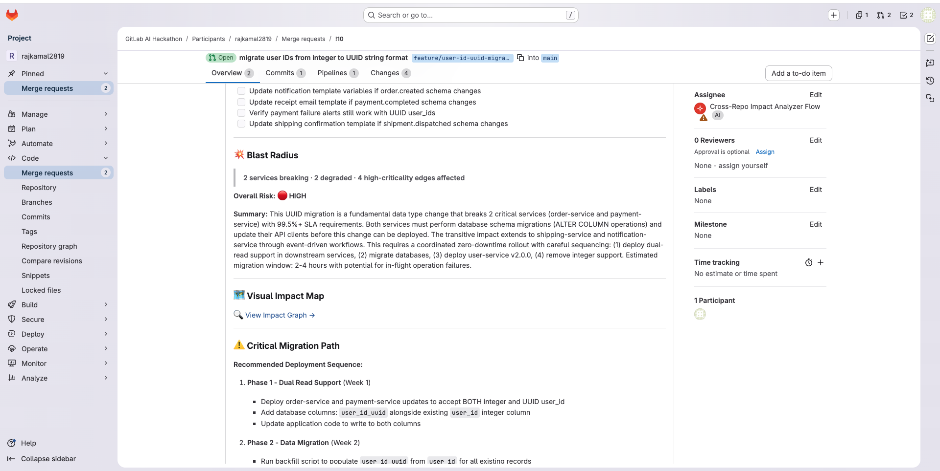 - 💬 Posts a structured impact report directly as an MR comment — with per-team migration checklists, owner contacts, and Slack handles