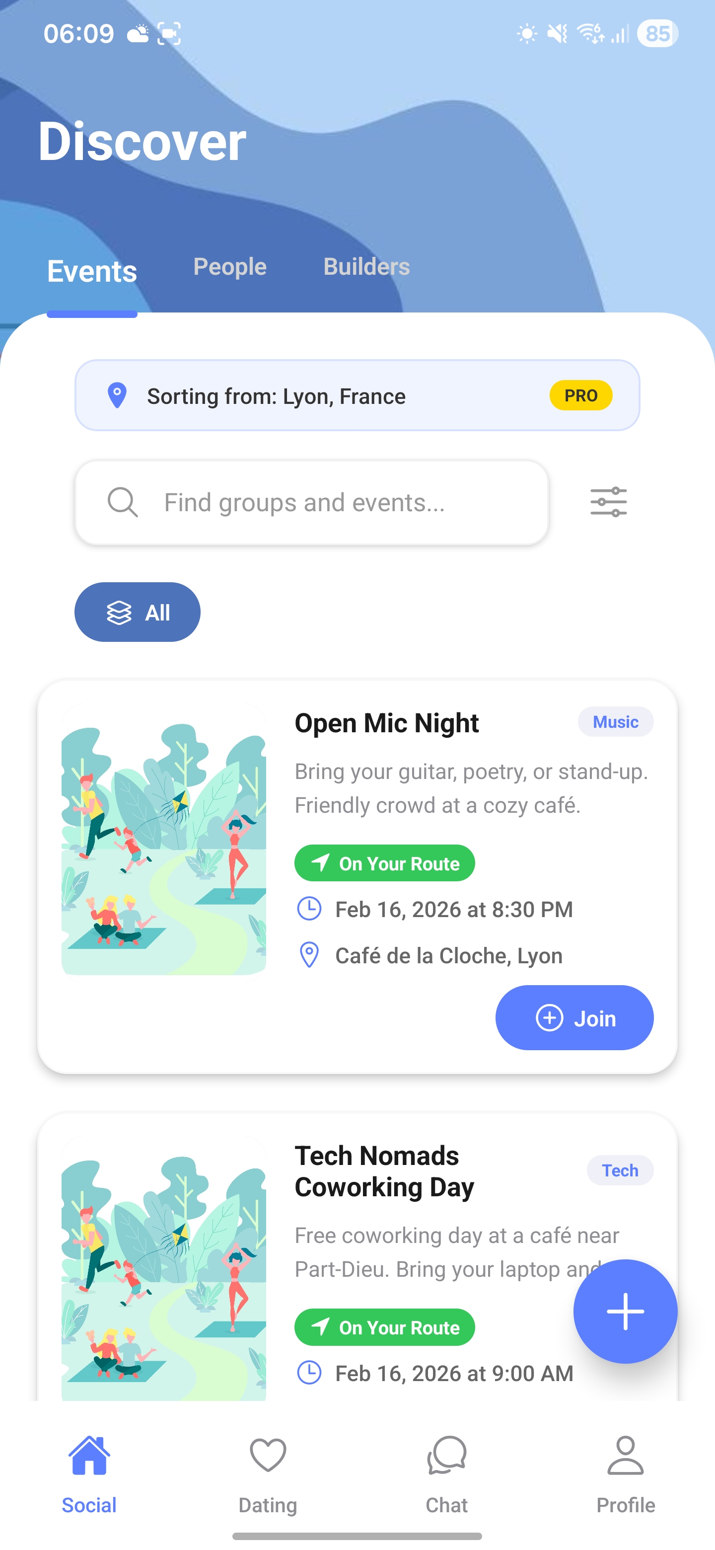 - Built multiple ways to connect: swiping, events, daily plans, and skill-based community support