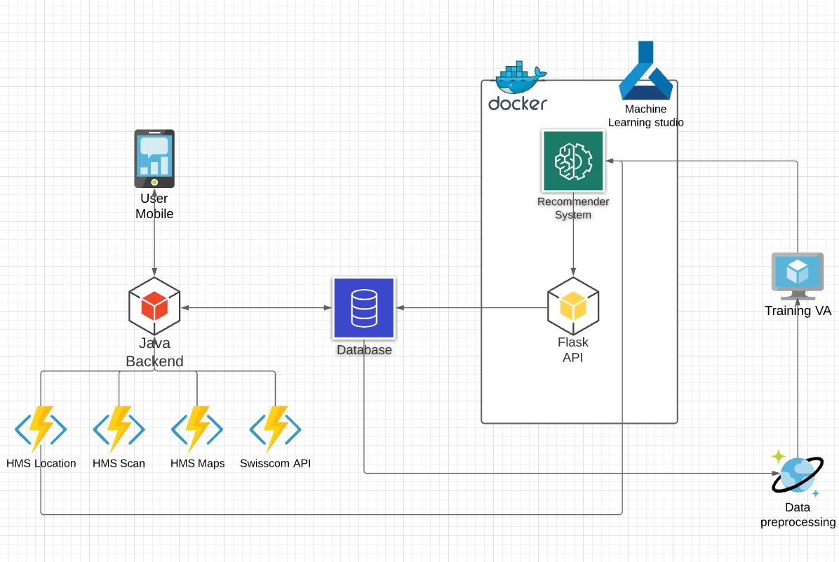 By joining the workshops, we learned a lot about services provided by sponsors like Swisscom, Huawei, IBM, and Helsana. For example, from the Swisscom API we learned about the Swiss special coordinate system! Huawei helped us out by borrowing a fantastic Huawei Mate device for us to test the app on! The Microsoft team sent our team very useful documentation that helped us while developing the MVP. We learned how to use the Microsoft Azure platform to deploy our application. On the academic side we read some really useful articles about recommender systems and the necessity of improving them.