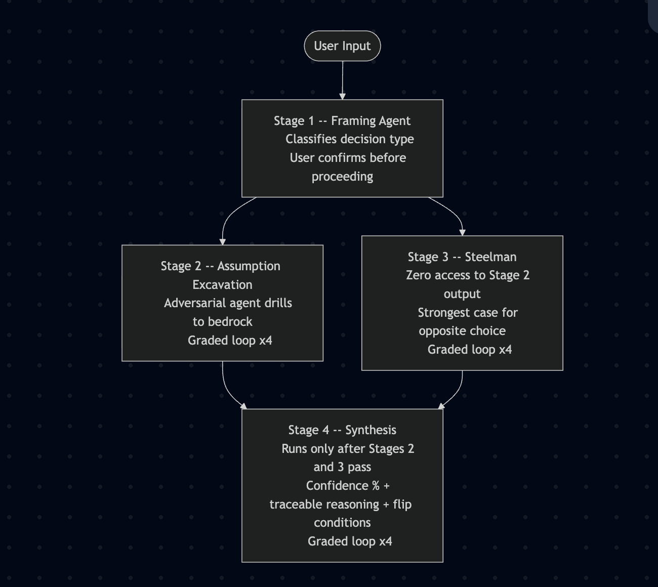 - Steelman: a separate agent, with zero access to Stage 2 output (prevents anchoring), builds the strongest possible case for the opposite choice.