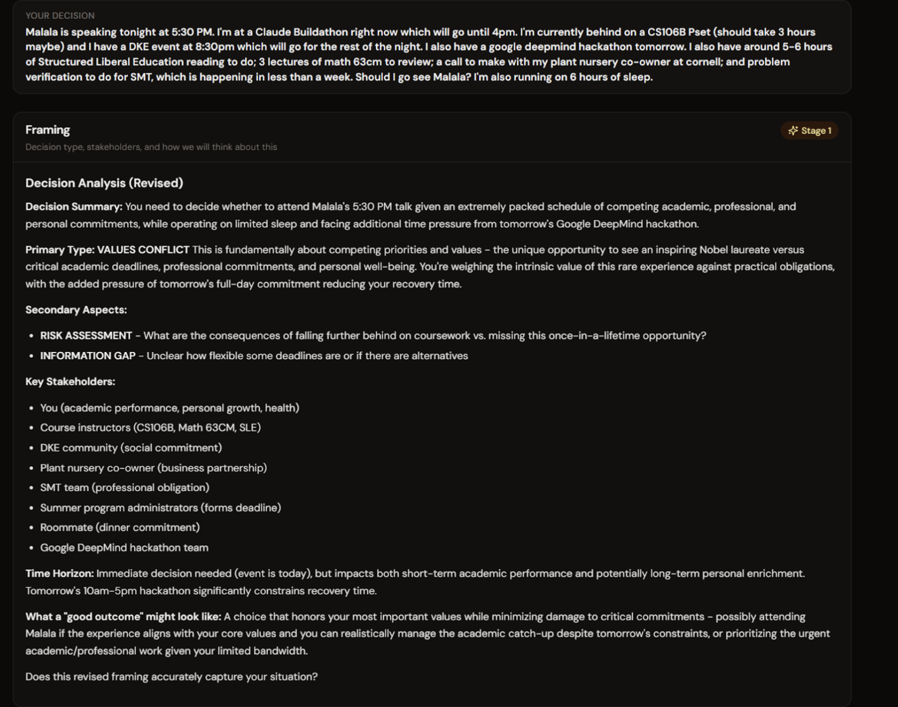 - Framing: classifies your decision type (values conflict, information gap, risk, interpersonal). You confirm before anything proceeds.