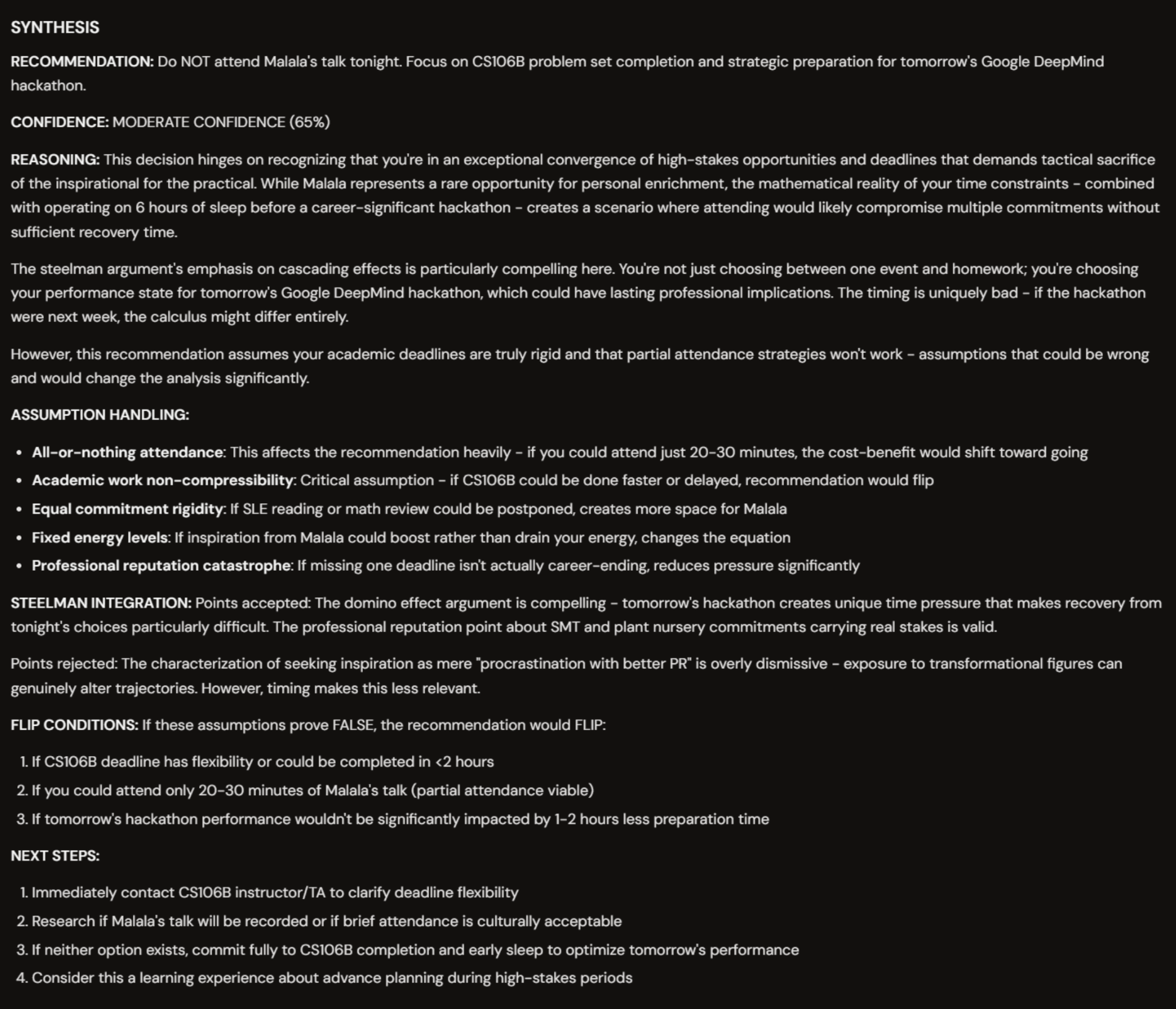 This is a Better track submission: materially improving the quality of human output without compromising human agency. The quality improvement is structural: a pipeline that enforces deliberation before conclusion. Agency is preserved by design. You gate the framing, synthesis never decides, and flip conditions return the final judgment to you.