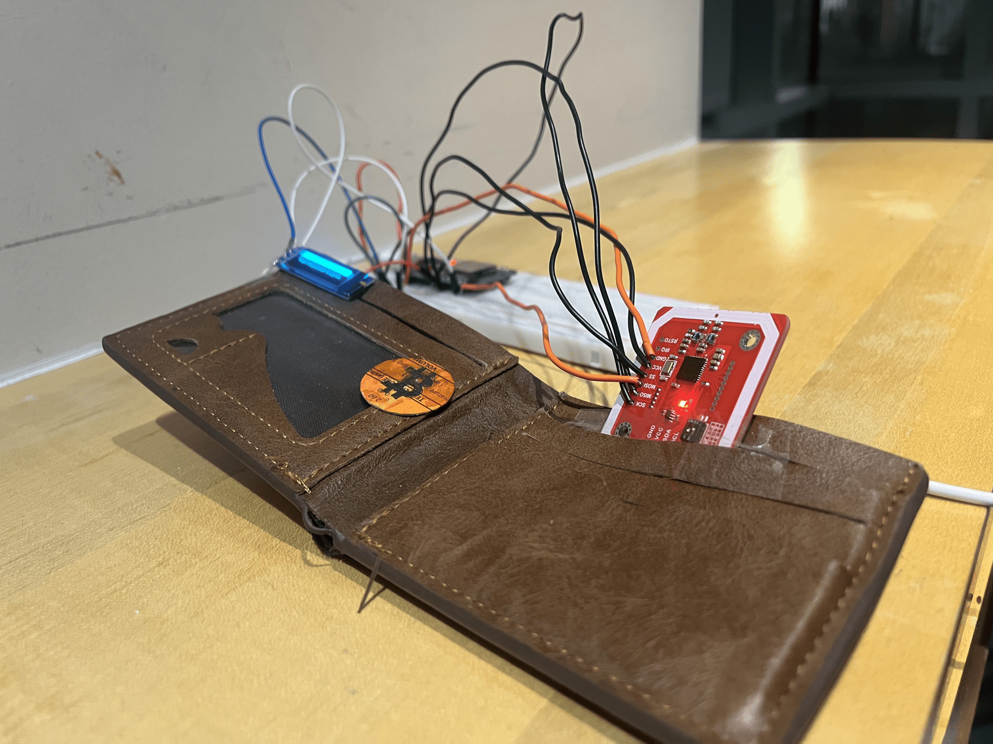 The smart wallet is the receiving end of every trade. It's built around an ESP32 microcontroller, an NFC PN532 reader, and a small 0.92" OLED screen. When a coin is tapped, the firmware reads the coin_id from the JSON payload and immediately queries the backend. If the transfer window isn't open, the API returns a 403 and the screen simply reads "Coin Locked." If the window is active, something more interesting happens, before the transfer goes through, the wallet fetches an AI-generated risk assessment of the coin's transaction history. The recipient sees a Risk Score and an English explanation of whether the trade looks clean or suspicious. They then make the call: authorize the transfer, or cancel it. The ESP32 connects to the internet through an iPhone hotspot, keeping it minimal for the demo.