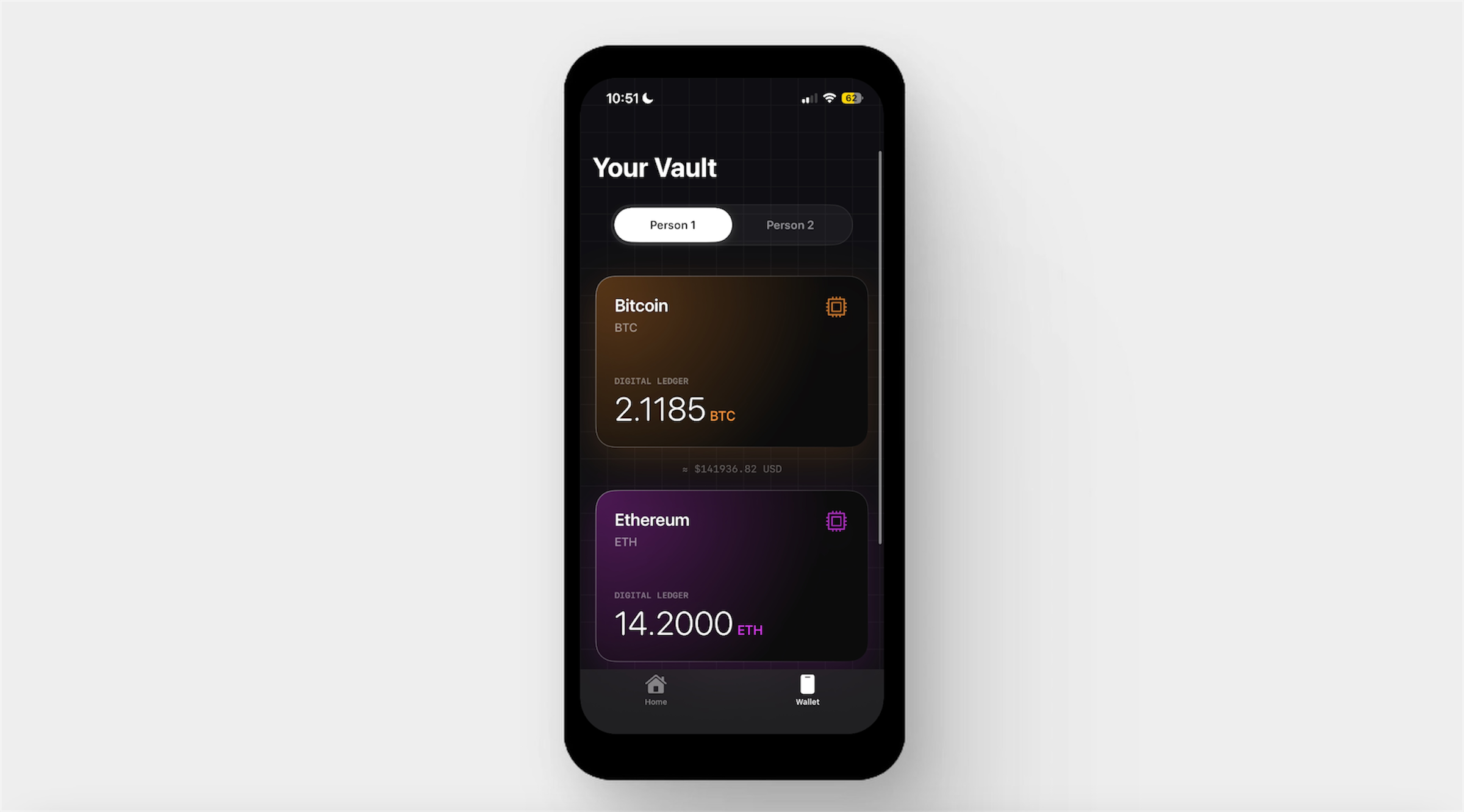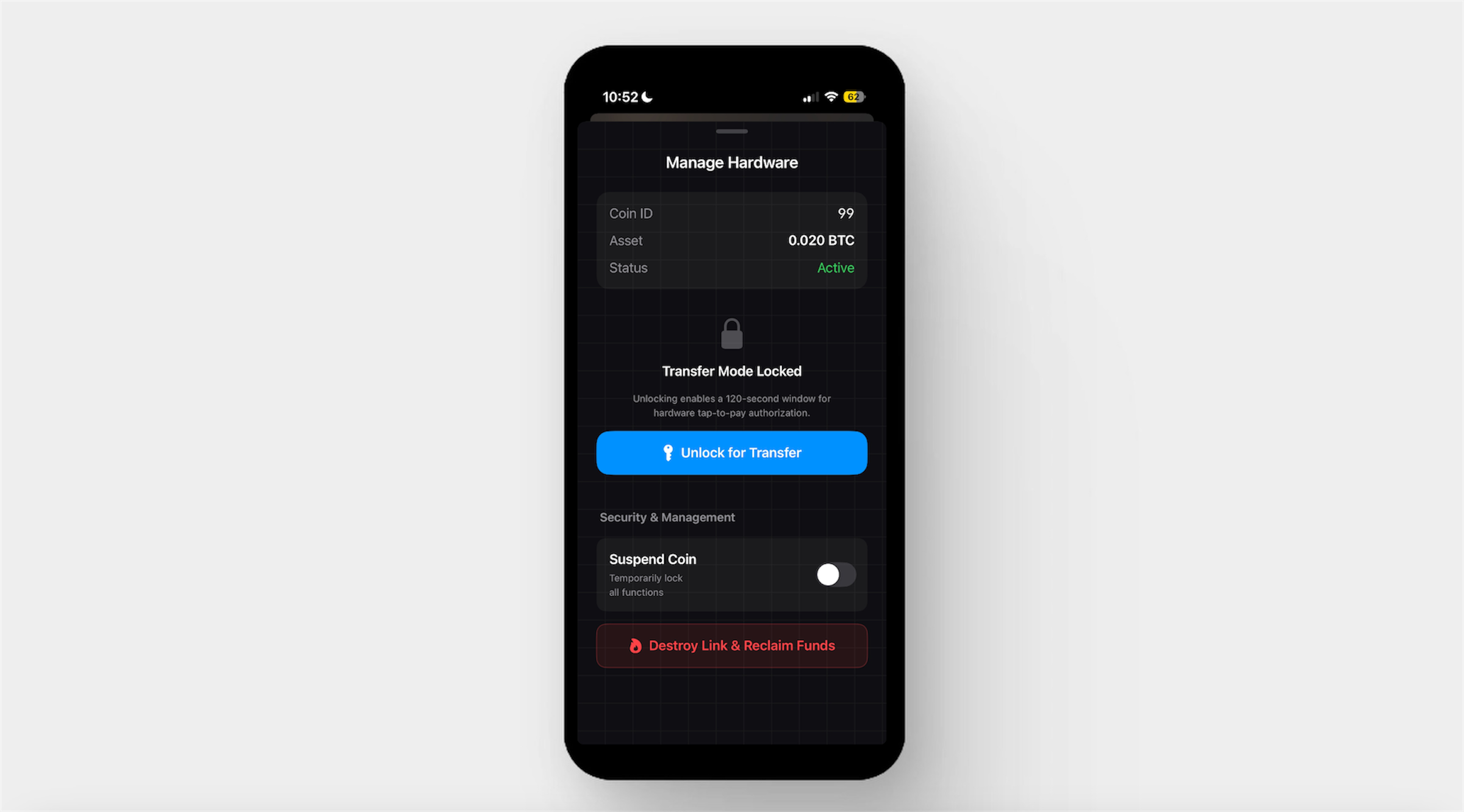 The mobile app is built in Swift with Xcode. It's the coin owner's control center: managing their digital wallet, assigning value to a physical coin, and opening the 2-minute transfer window that arms the handoff.