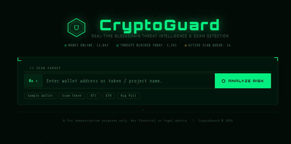 CryptoGuard is a fully client-side blockchain security simulator that helps users evaluate whether a crypto wallet address or token/project name is potentially safe, suspicious, or a scam.