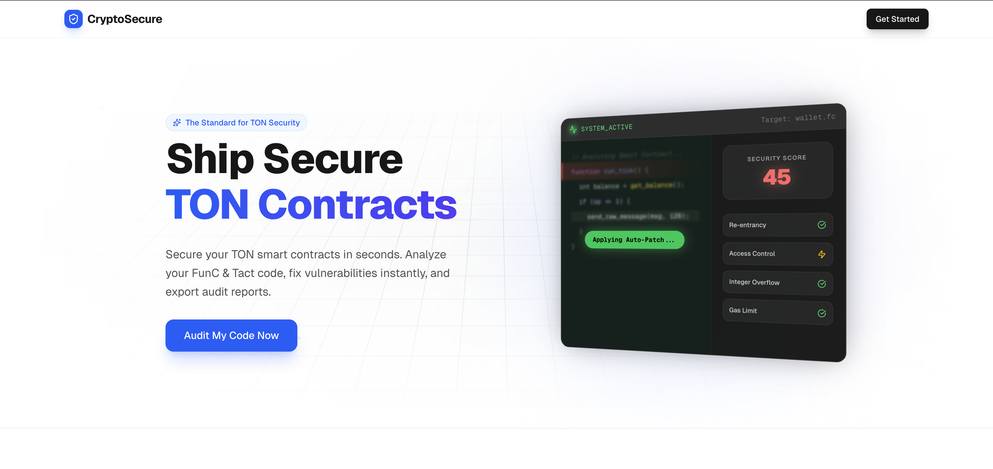 CryptoSecure is an AI powered security scanner and auto fixer for TON smart contracts.
