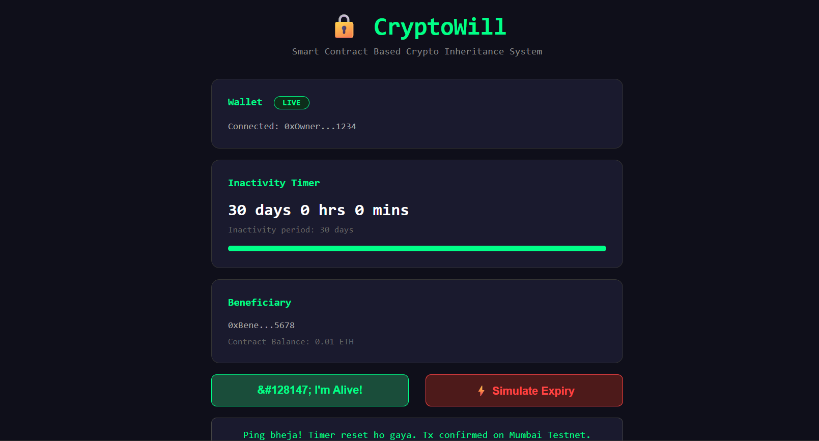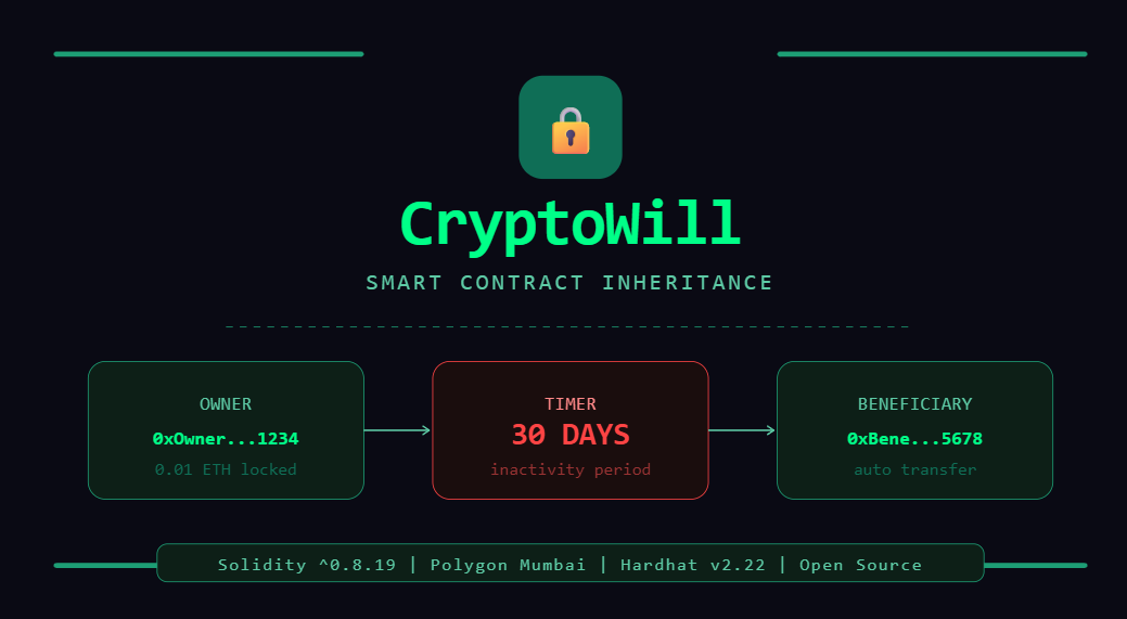 CryptoWill is a smart contract that detects owner inactivity and automatically transfers funds to the beneficiary — no third party needed.