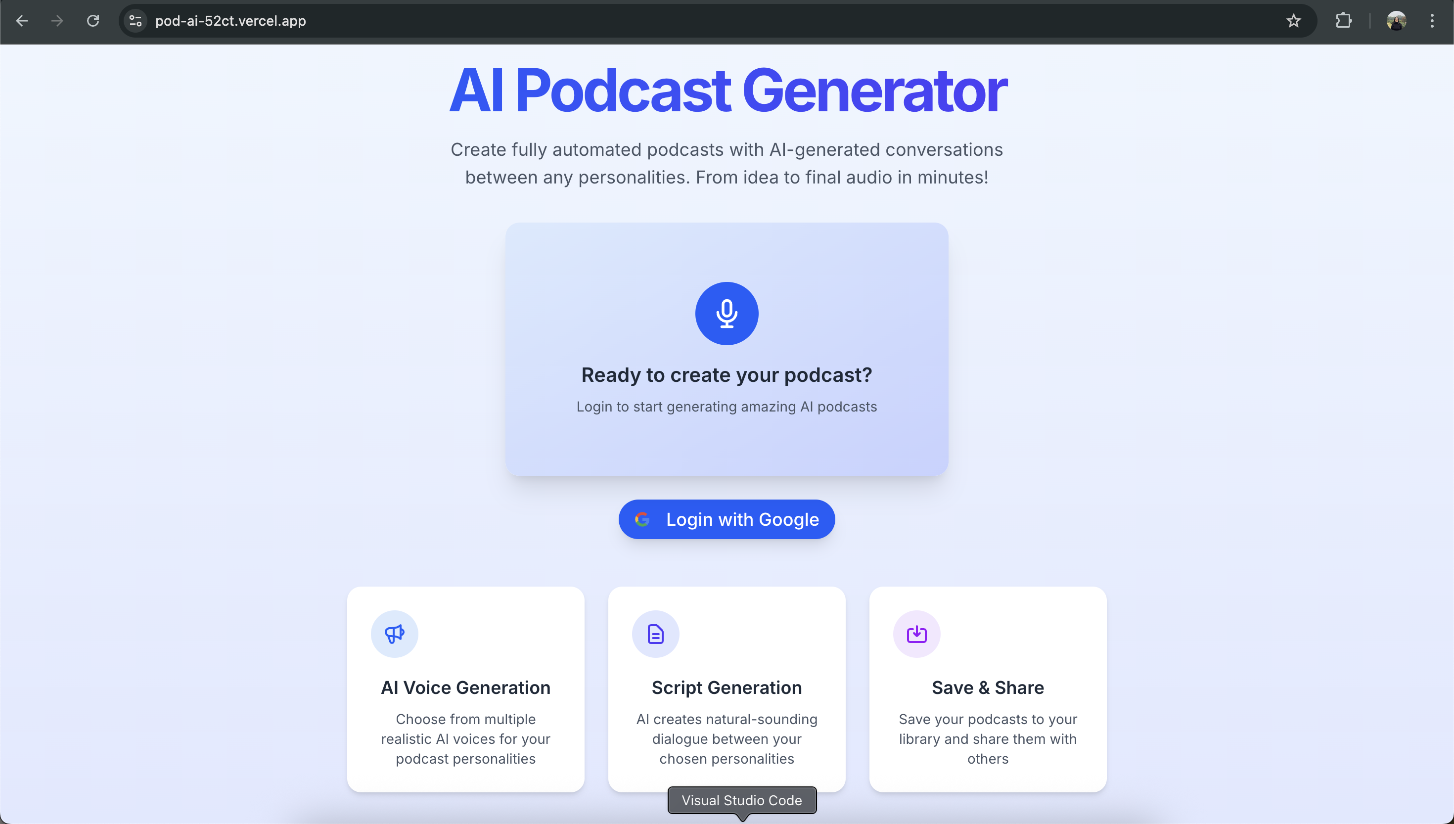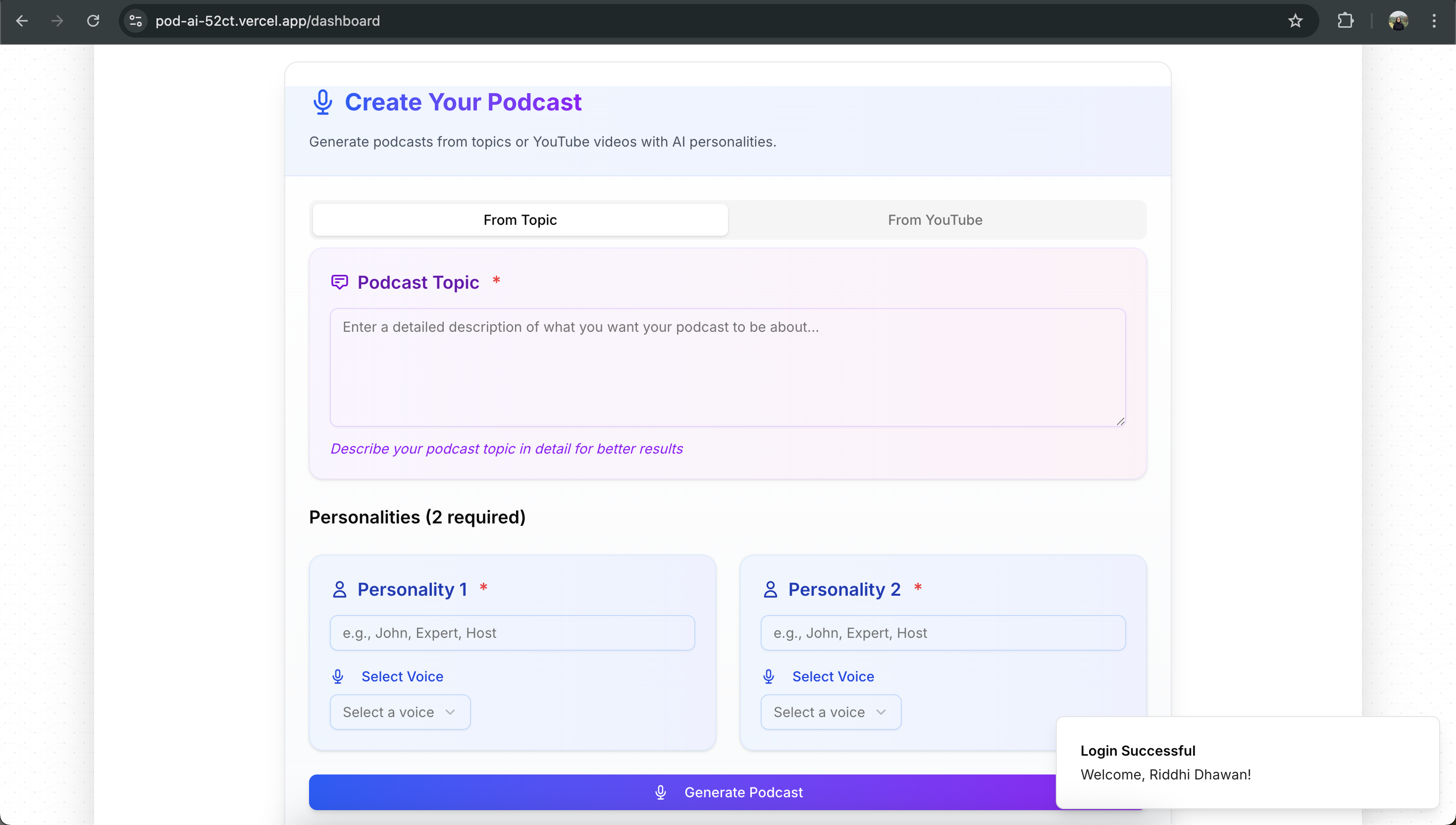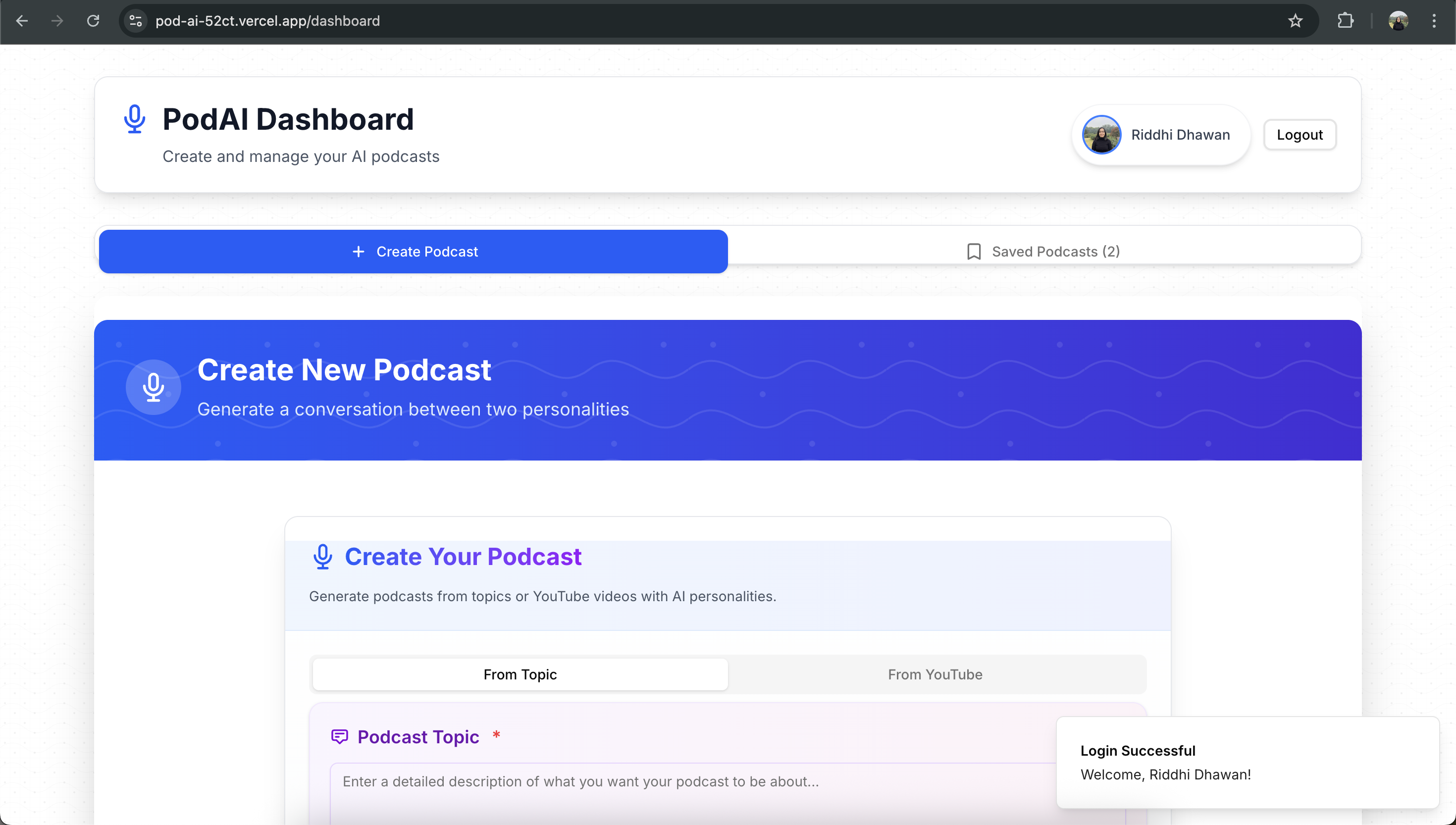 With the rise of AI-generated content and the increasing demand for accessible podcasting tools, we wanted to create a platform that empowers anyone to generate, store, and share unique podcasts with minimal technical effort. Our project aims to democratize podcast creation, making it possible for users to produce high-quality audio content powered by AI, all within a simple and intuitive interface.