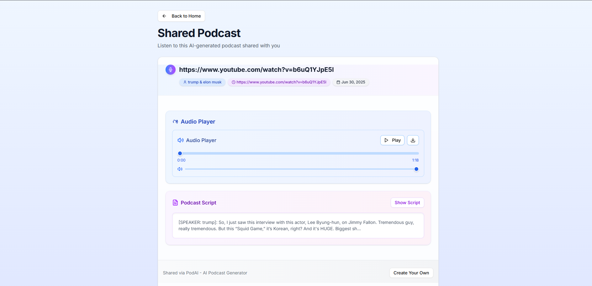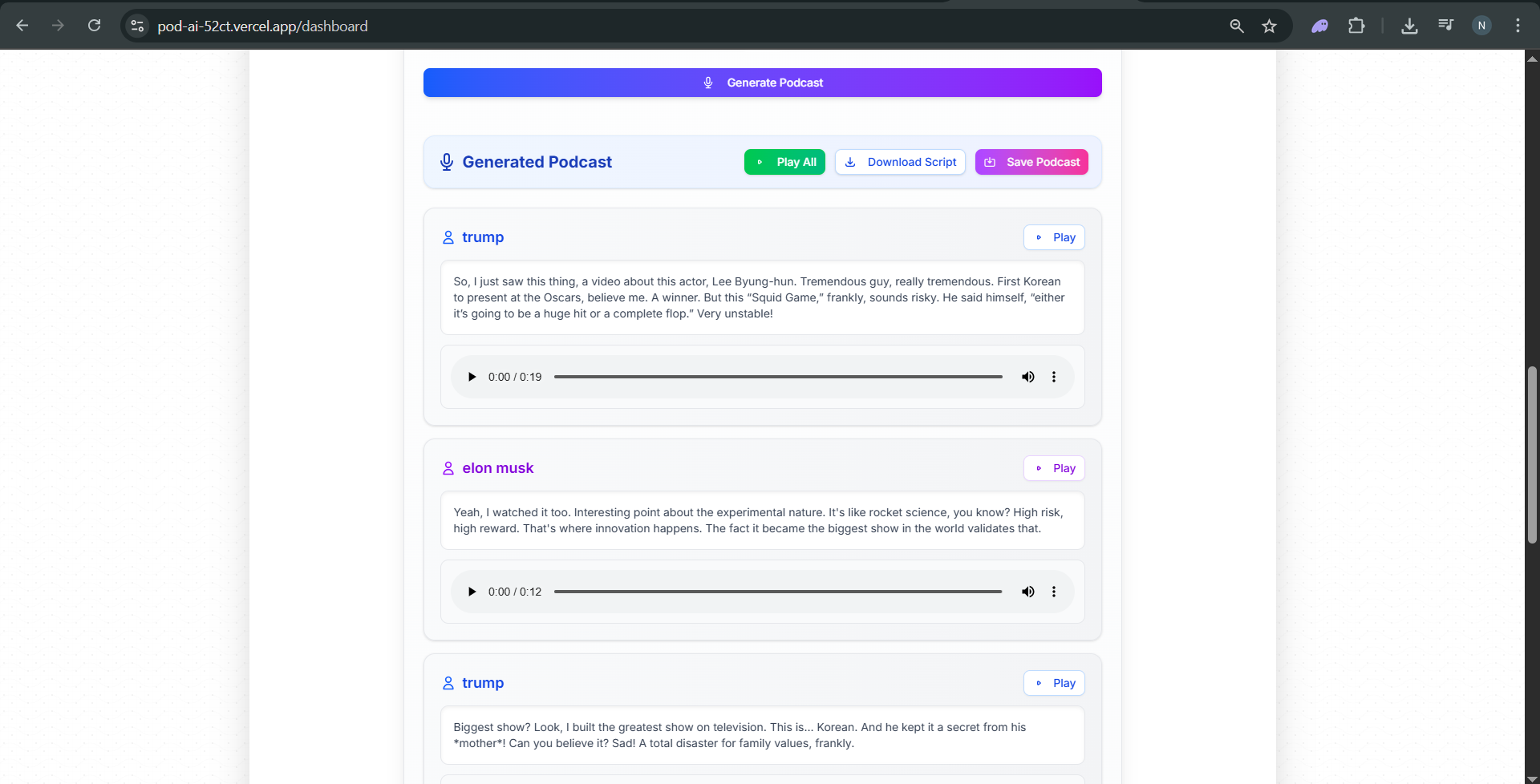 AI Podcast is a web application that lets users generate podcasts using AI, save their recordings, and share them with others. The platform allows users to: