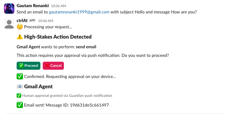 Here's what a single request looks like end to end: an employee messages the Slack bot "Send an email to Sam about the meeting." The LangGraph orchestrator routes it to Gmail Agent, checks that Gmail Agent is active and has the send_emails scope, retrieves a token from Token Vault, detects that sending email is a high-stakes action, fires a CIBA request through Auth0, and the admin gets a Guardian push notification on their phone. The agent waits. If the admin approves, the email gets sent. If not, nothing happens. The entire sequence is logged to the audit trail and visible on the admin dashboard.