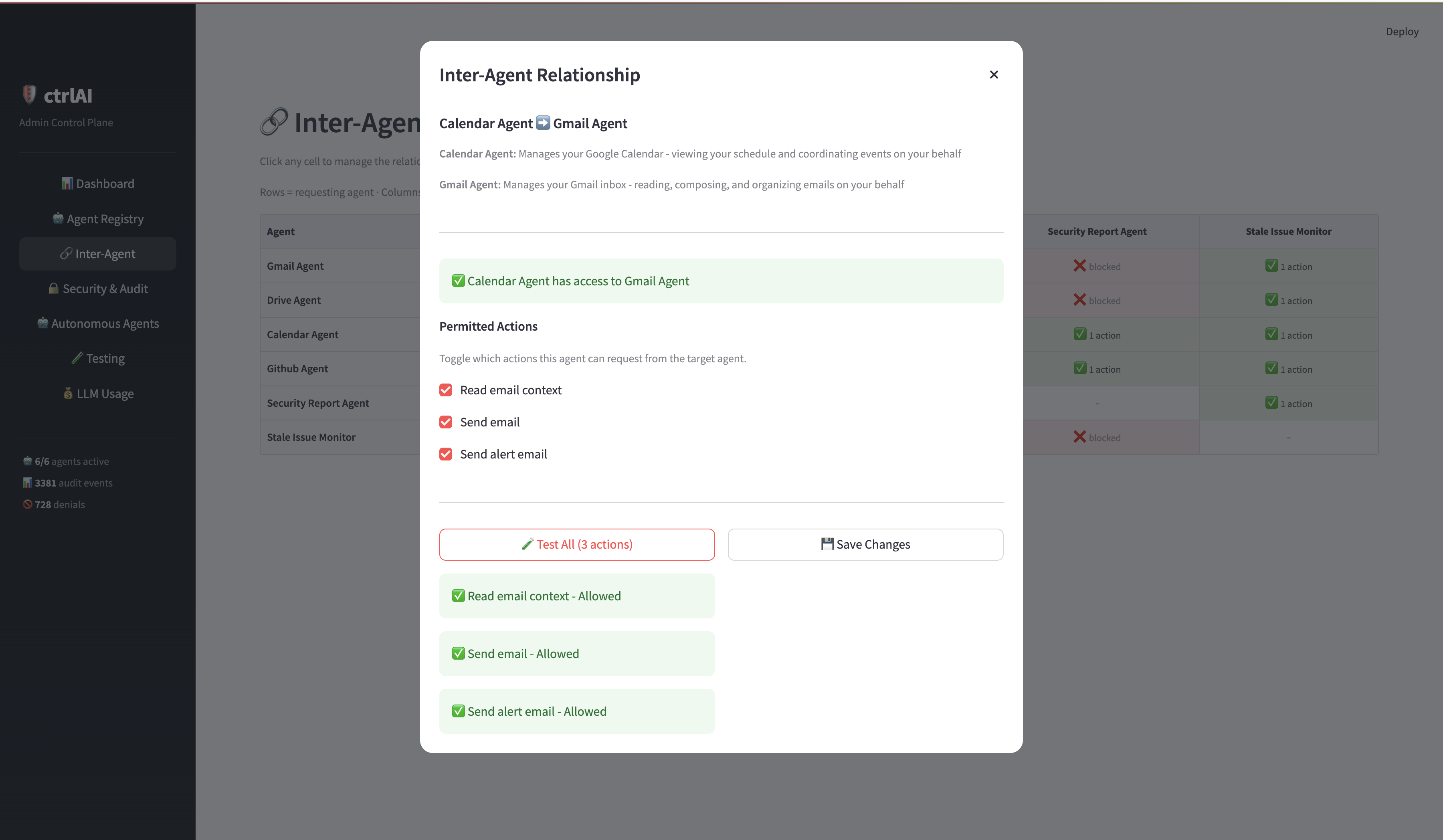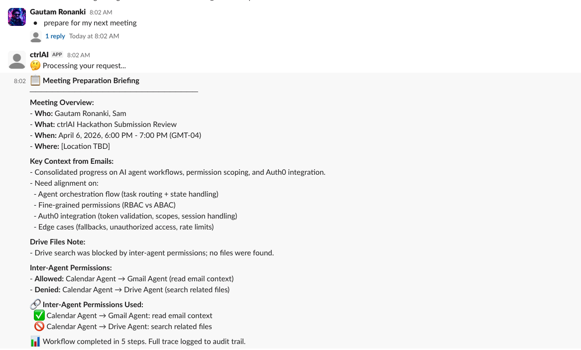 One more observation: inter-agent communication is an underexplored security surface. Most frameworks treat agent-to-agent calls as trusted. ctrlAI treats them as governed. Every inter-agent request is checked against a deny-by-default permission matrix, logged, and blocked if not explicitly permitted. I think this pattern matters as multi-agent systems grow in complexity, and I'd love to see Auth0 explore identity-based inter-agent authorization as a first-class feature.