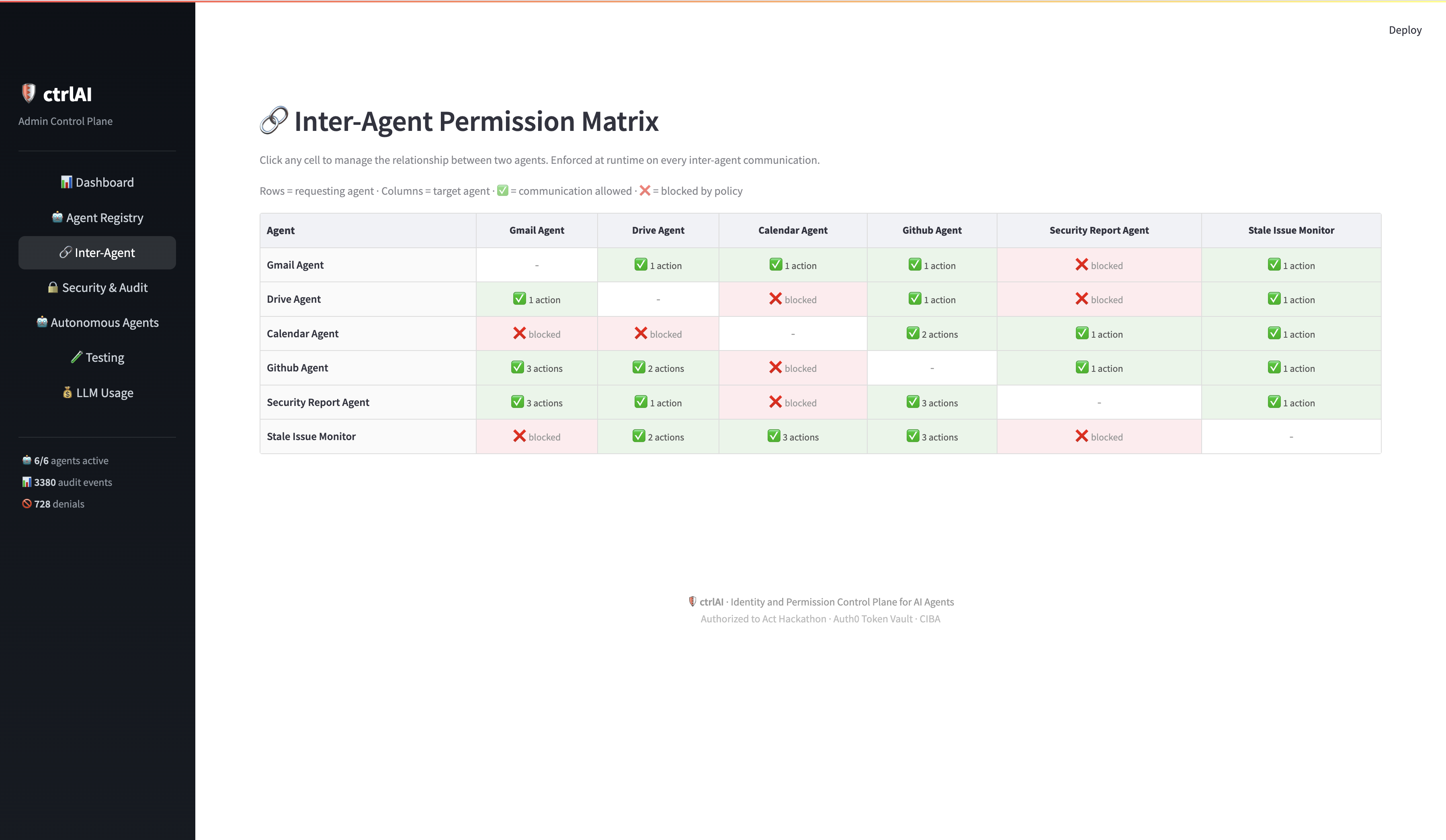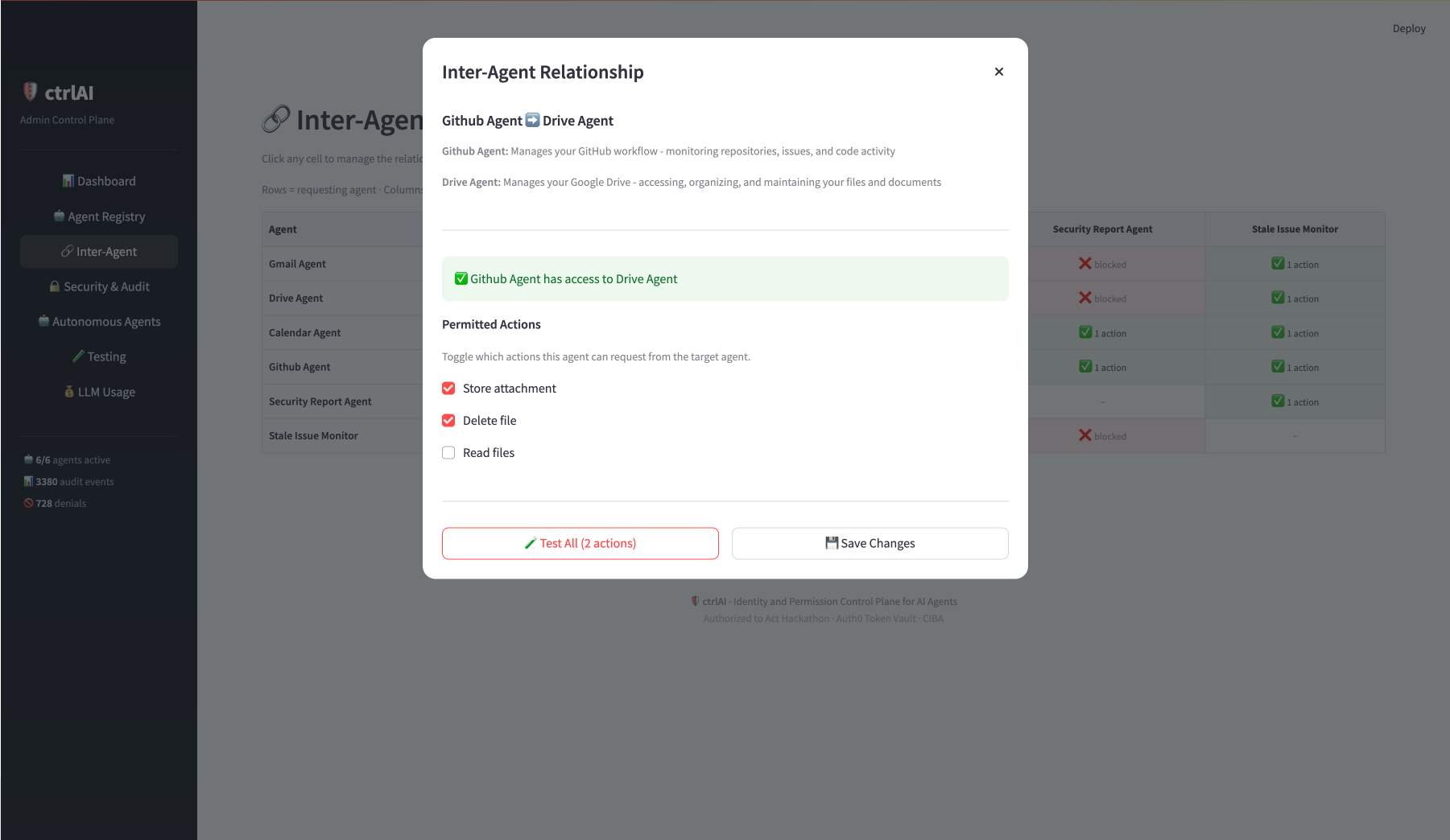 That's where ctrlAI came from. Why can't I manage all my AI agents from one place? One dashboard where I can see every agent's identity, toggle their permissions, control which agents can talk to each other, and review a single audit trail of everything that happened. And thanks to Auth0's Token Vault, I didn't have to build the entire OAuth and token management layer from scratch. Token Vault handled the credential storage and token exchange, which let me focus on the governance layer on top of it.