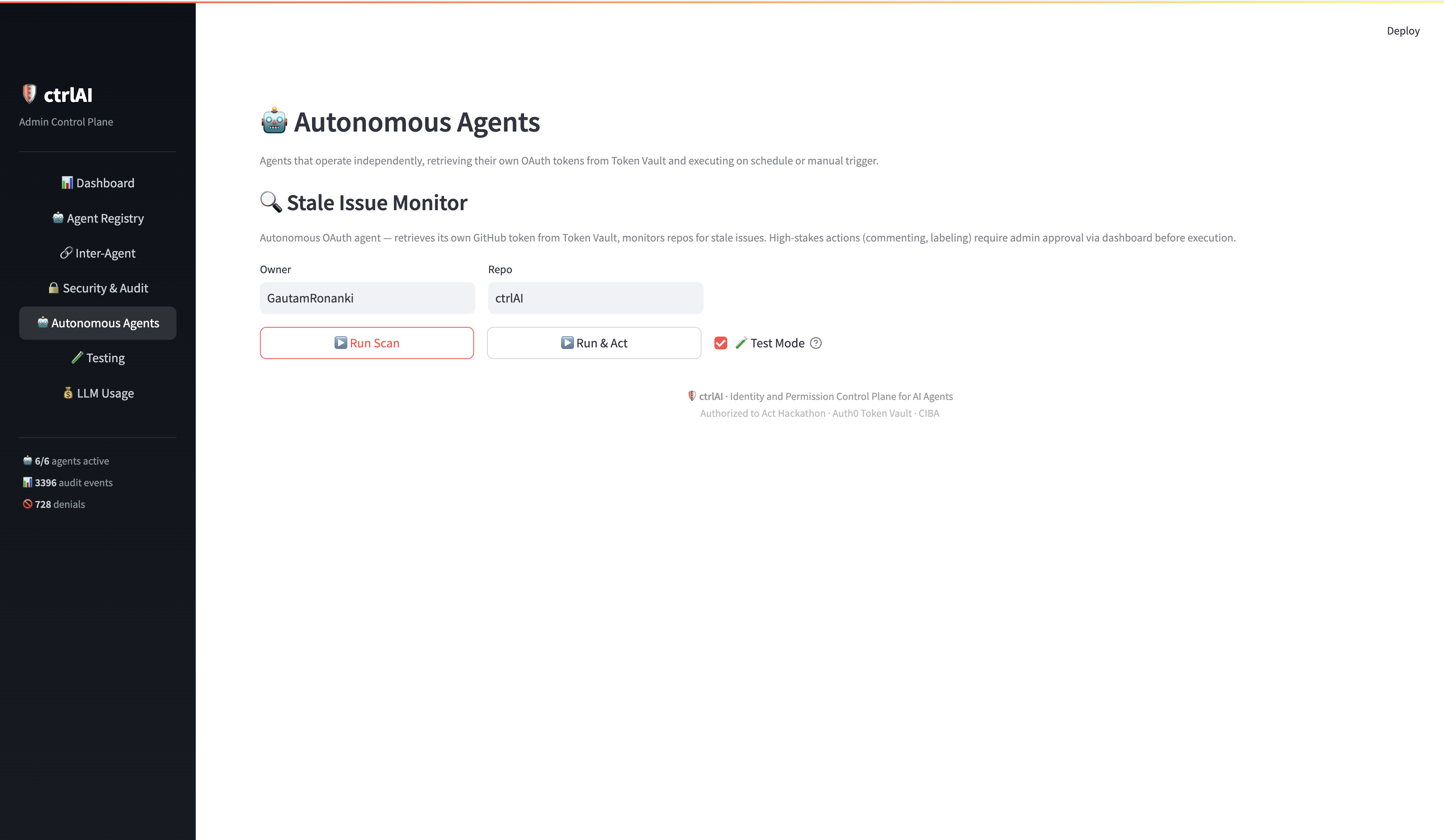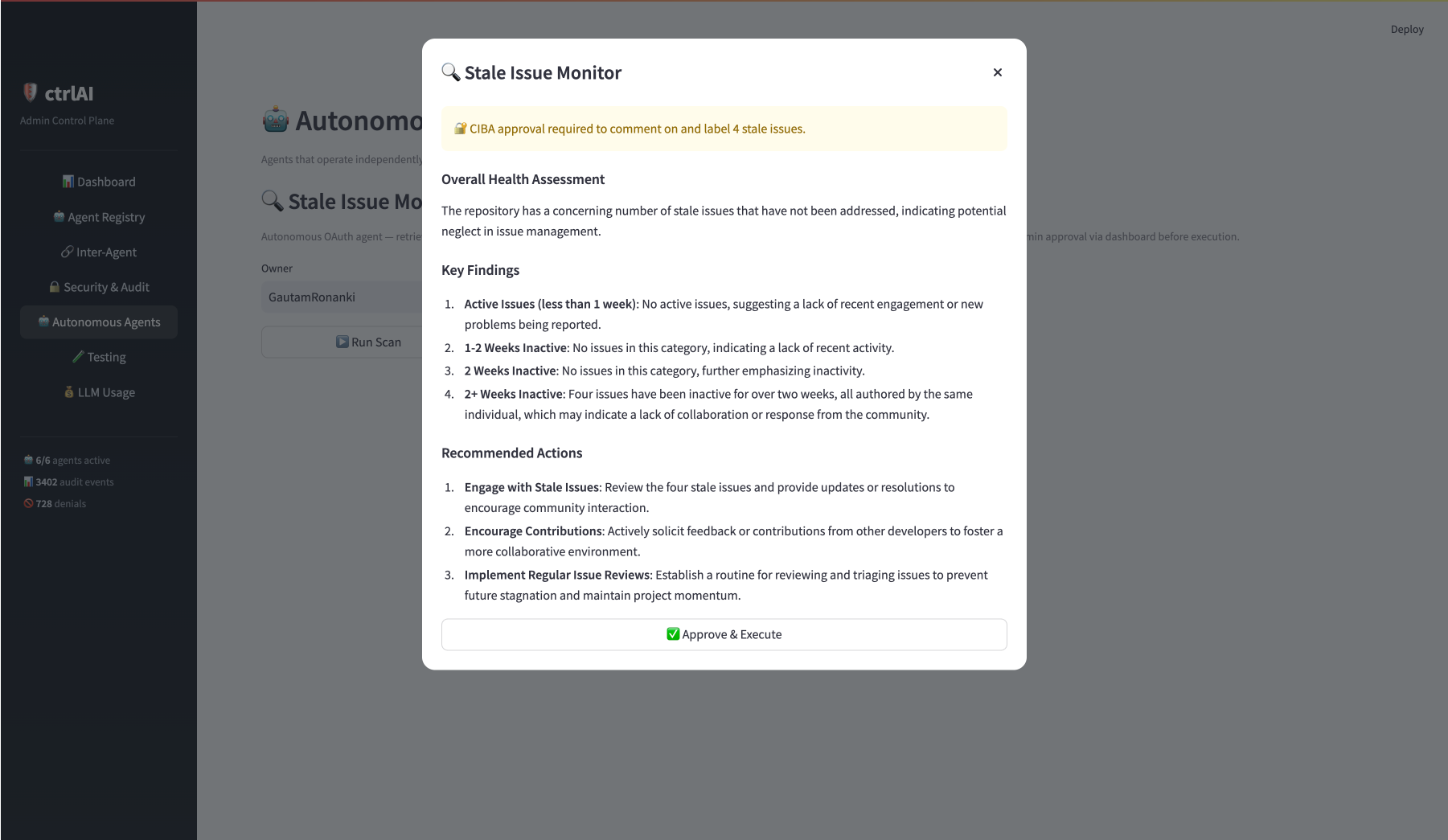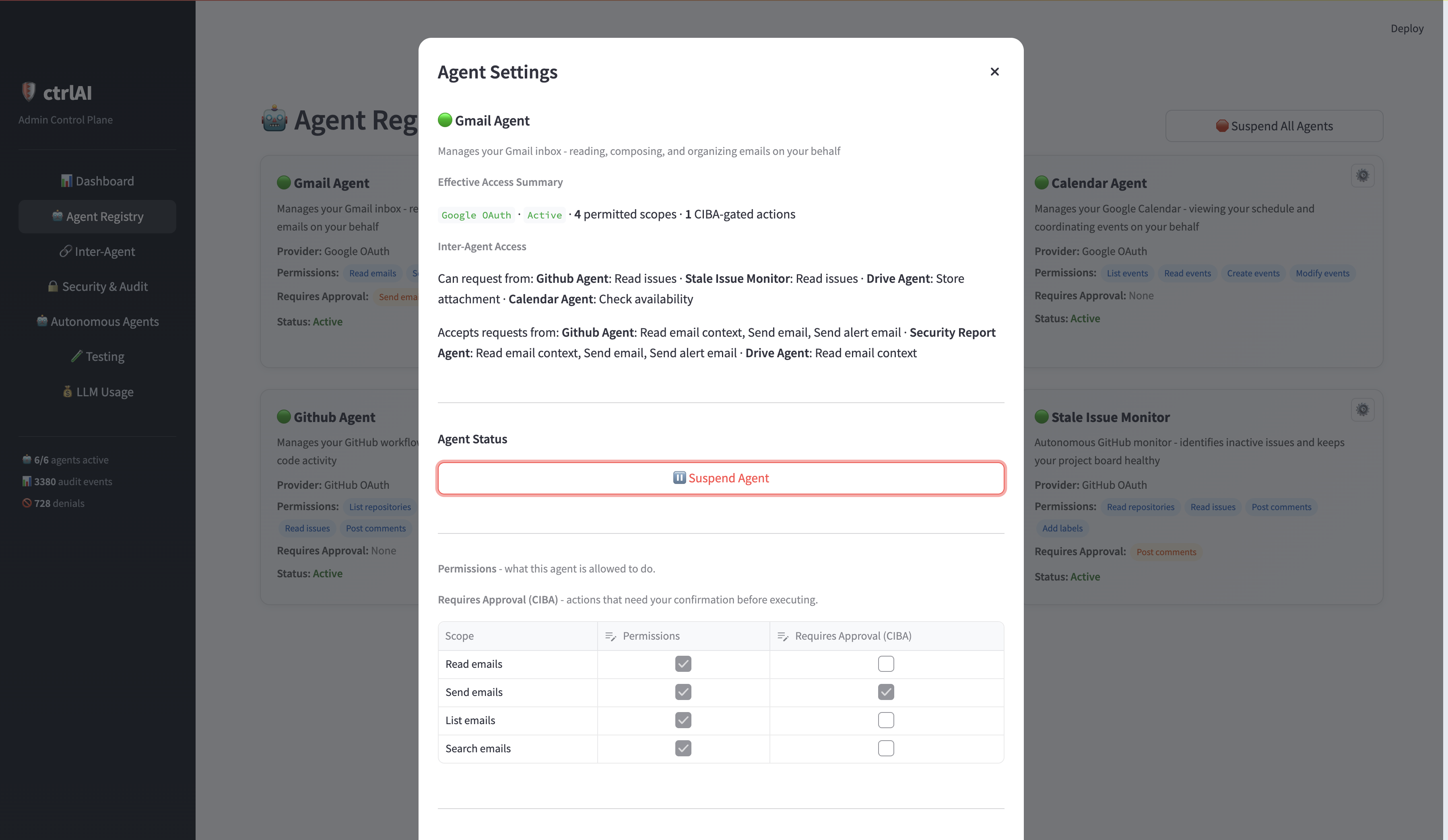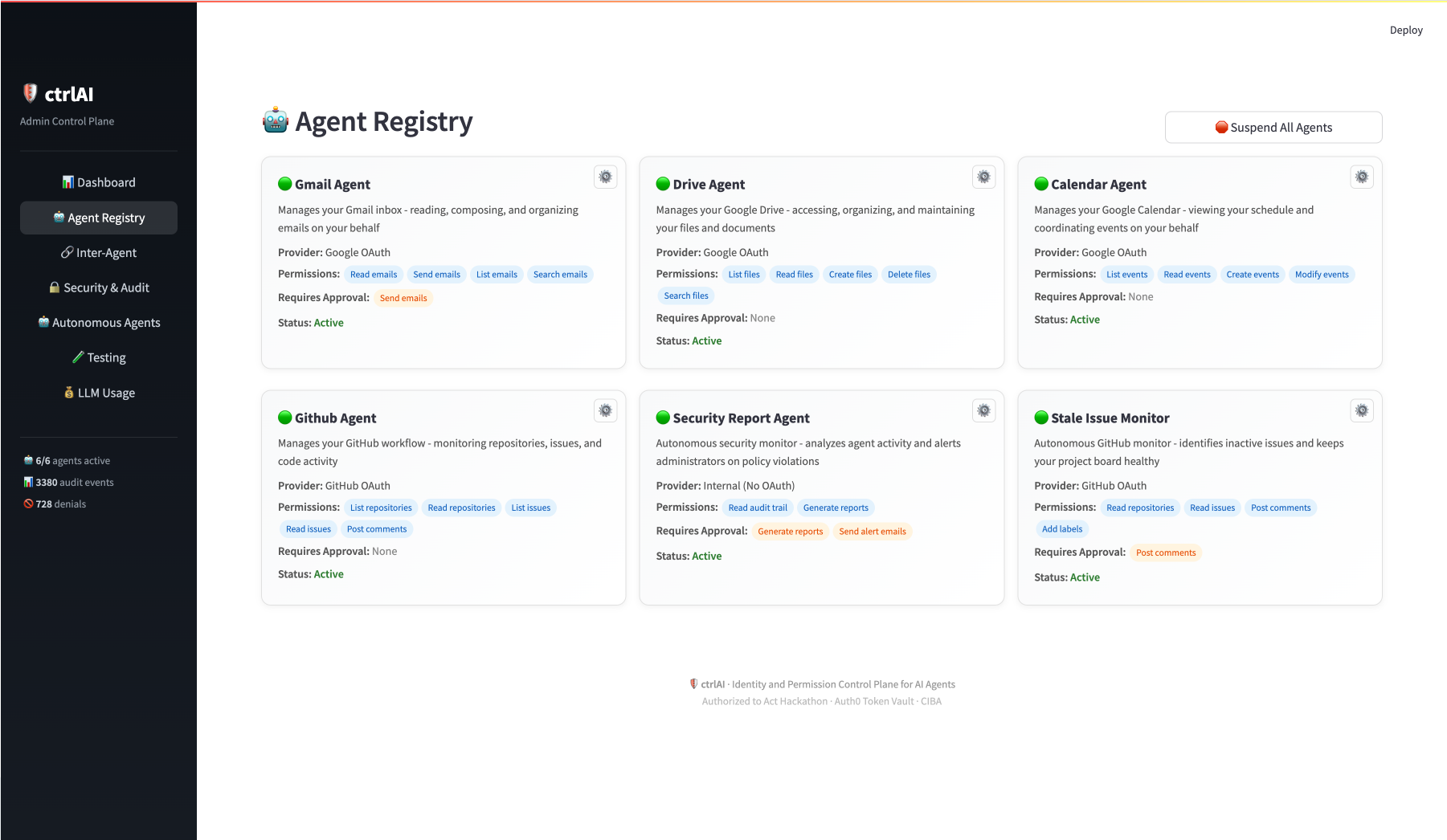 ctrlAI is an identity and permission control plane for AI agents. It governs six agents (Gmail, Drive, Calendar, GitHub, Security Report, and Stale Issue Monitor) from a single dashboard.