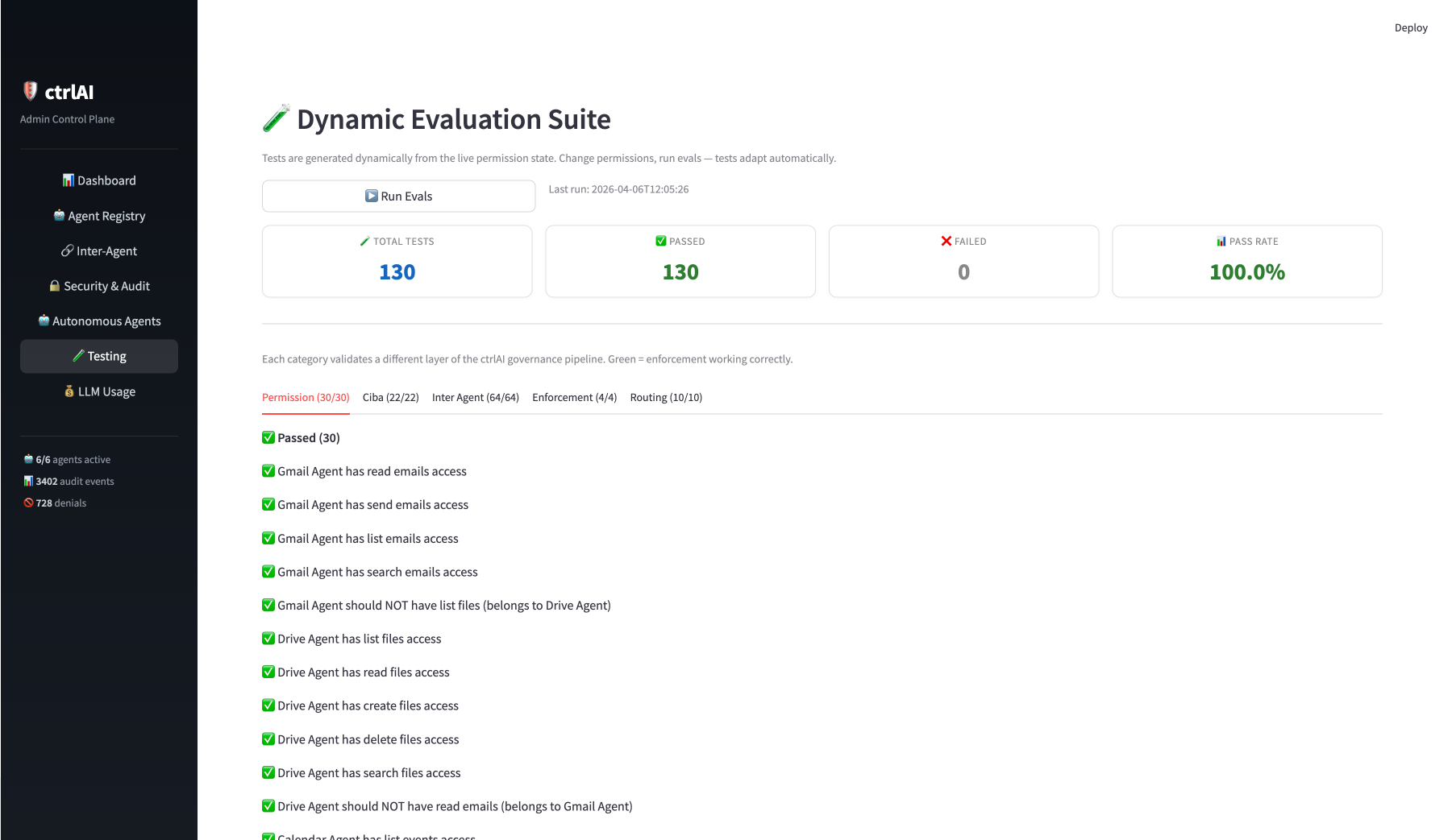 The eval suite generates tests dynamically from the live permission state. Change a permission, run evals, and the test suite adapts. Four enforcement tests actually mutate live state (revoke a scope, suspend an agent, remove inter-agent access) to prove the system responds correctly, then restore everything in try/finally blocks.