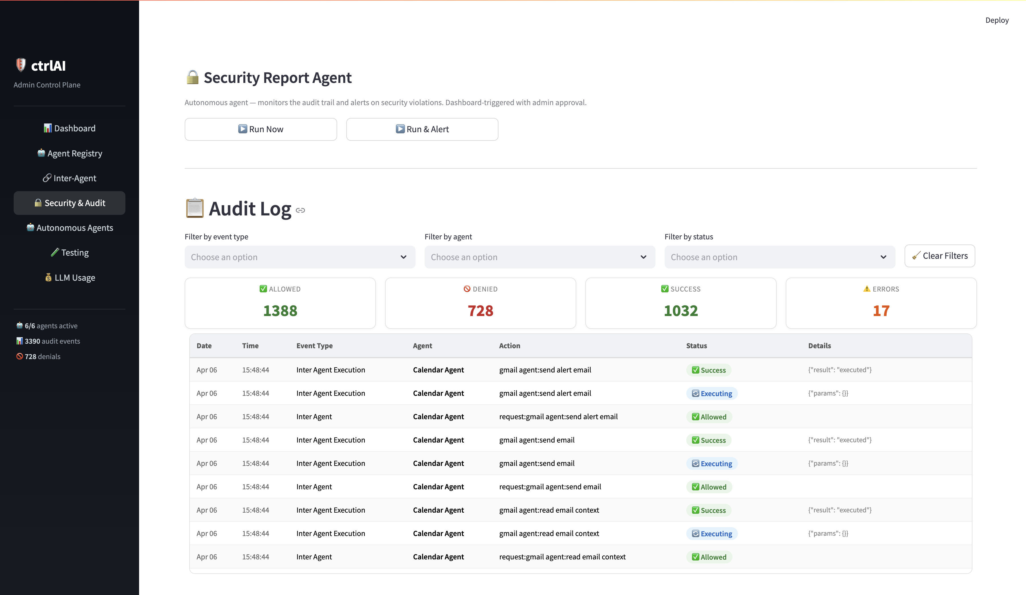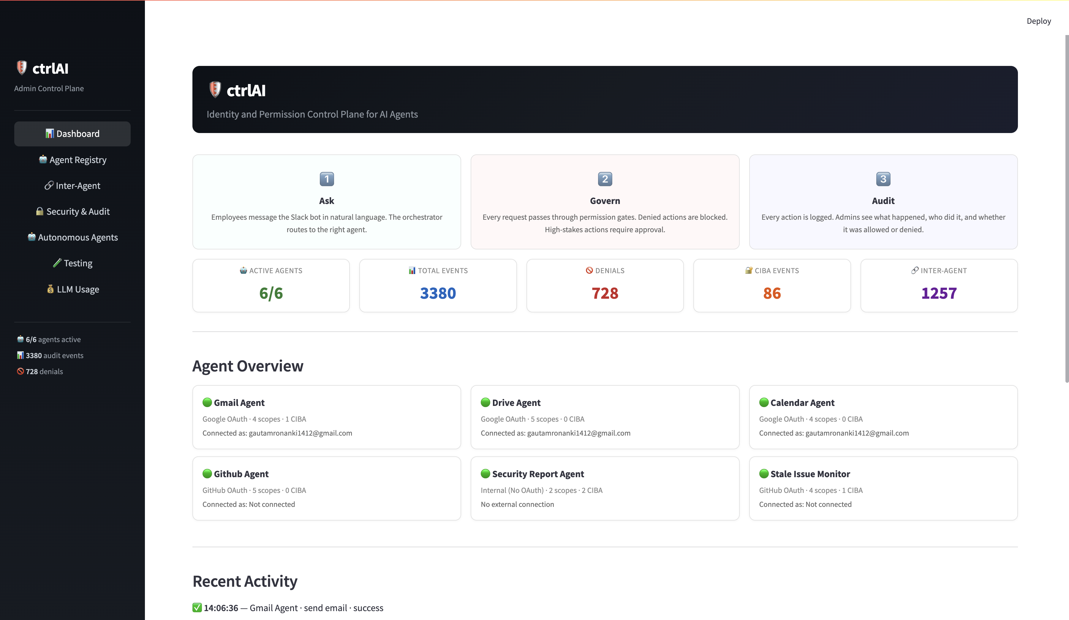 Organizations are adopting AI agents because they genuinely help. But without governance, you end up where I was at work: four agents, four dashboards, four separate permission systems, and no unified view. That's the problem ctrlAI solves.