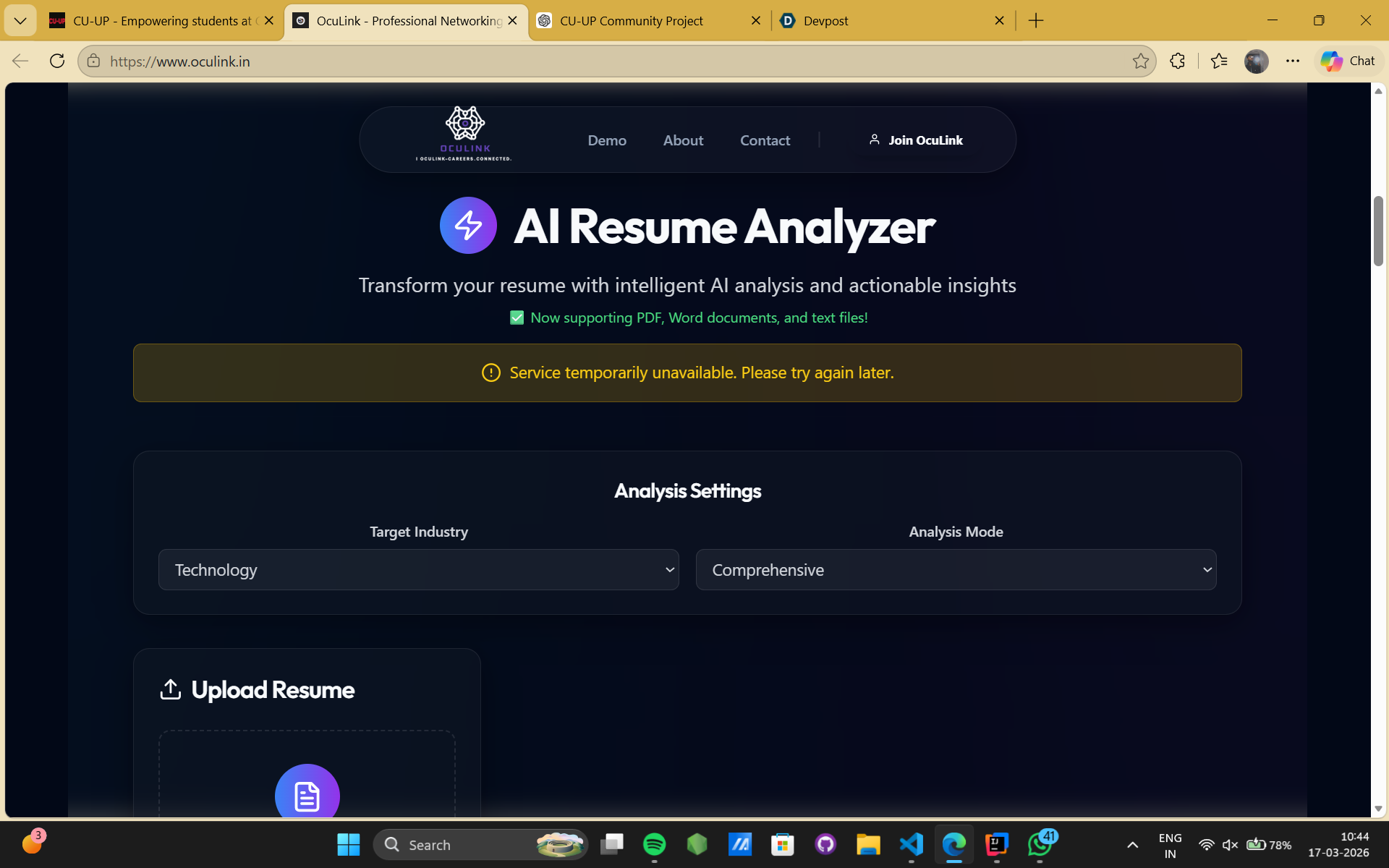 The platform features a DSA learning module that helps students practice problems, strengthen problem-solving skills, and prepare for technical interviews. For career development, it provides a resume builder along with AI-powered resume analysis, enabling students to create professional resumes and receive intelligent feedback for improvement.