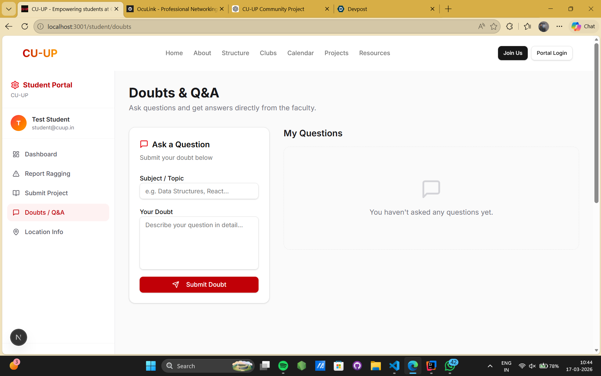 To enhance learning support, CU-UP Community includes a one-on-one doubt-solving system, allowing students to connect directly with teachers or mentors for personalized guidance and real-time problem resolution.