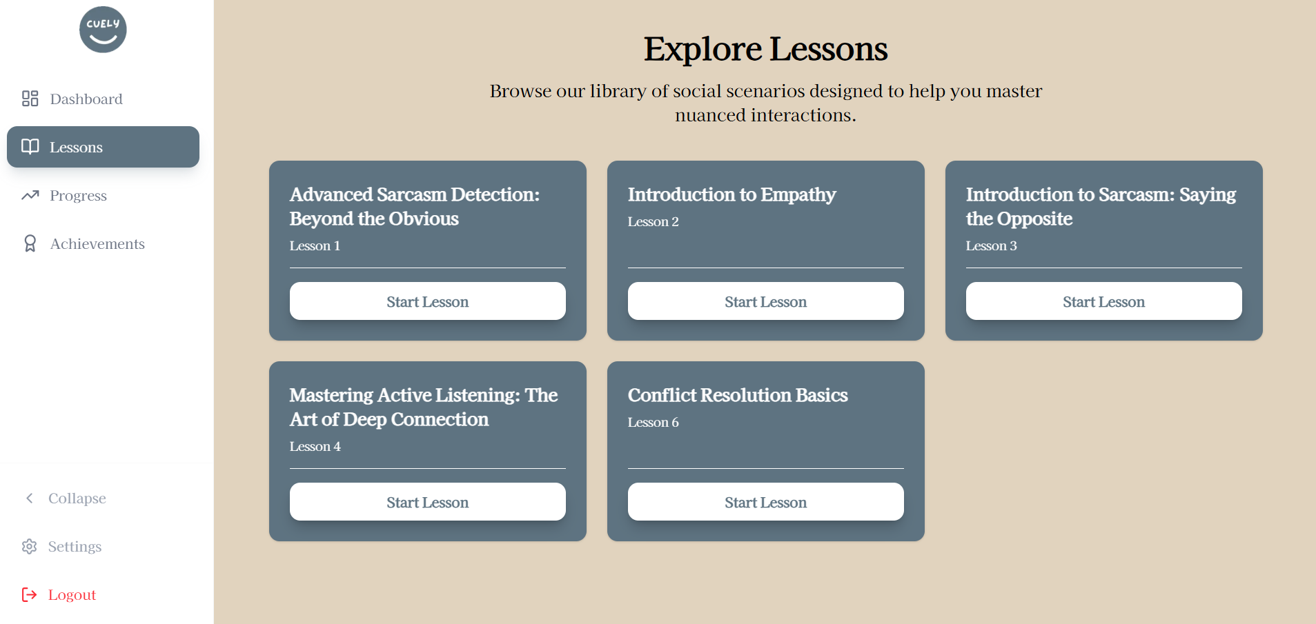 Cuely was born from a personal need for a better way to learn the social rules that don't come naturally to everyone. Our mission is to make that learning accessible, empowering, and rooted in triumph.