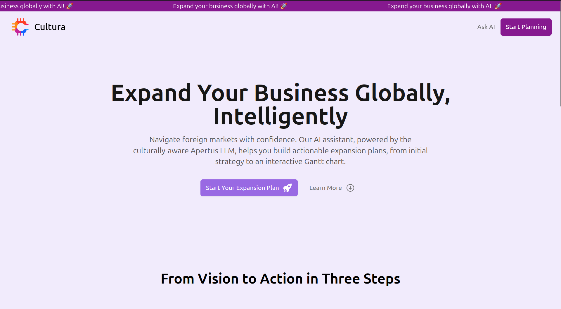 Cultura is an open-source AI agent built on Apertus that acts like a full international business consultant. It guides companies step by step through entering new markets: