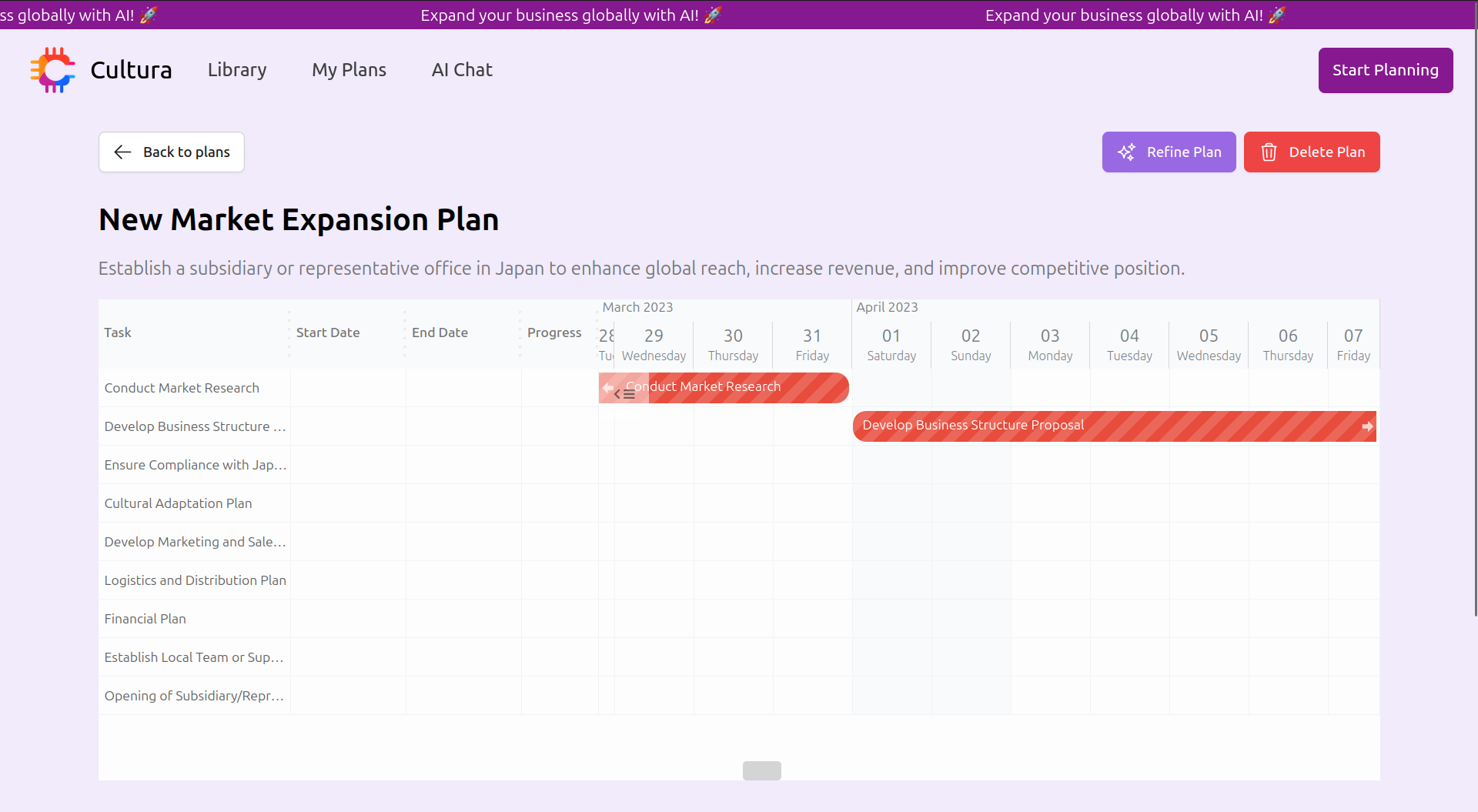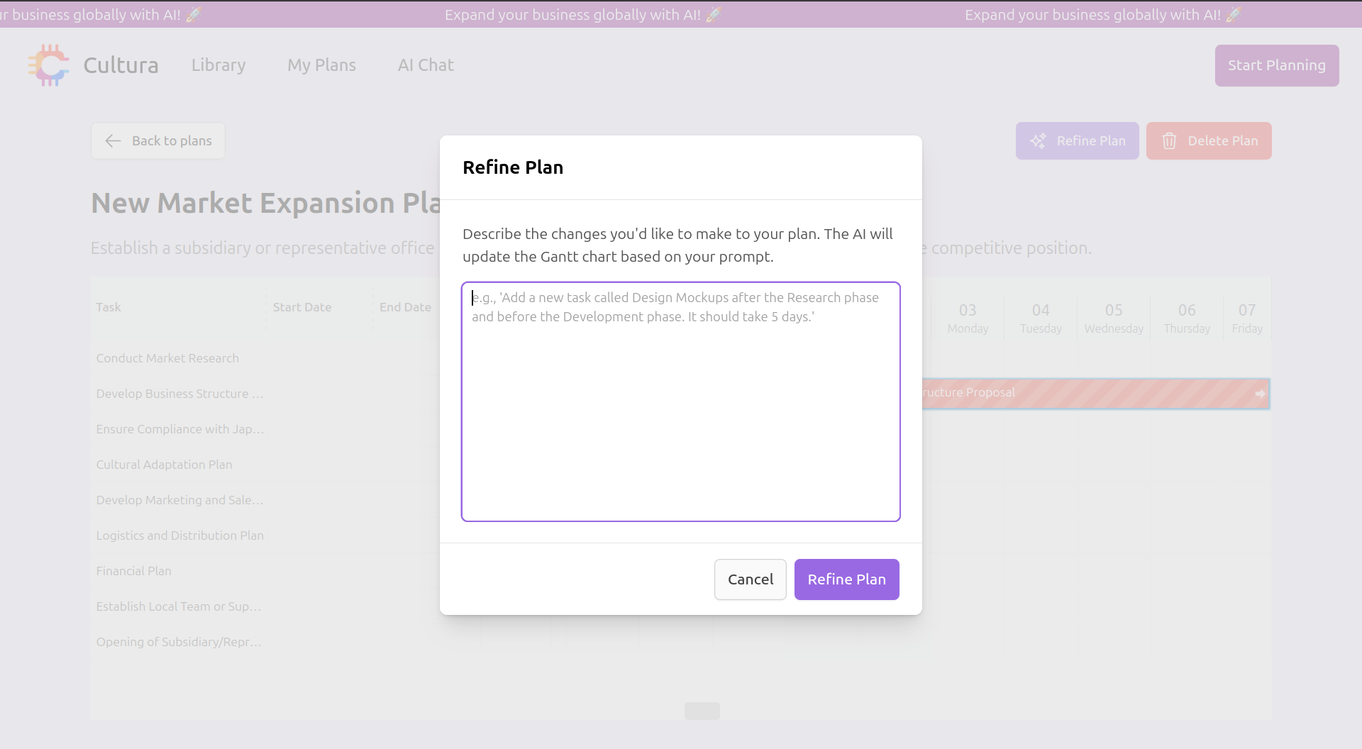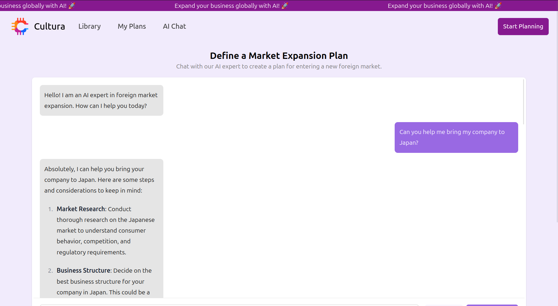 - Reviews emails or messages before they are sent to partners, ensuring cultural and legal appropriateness. In short, Cultura combines market intelligence, cultural expertise, and business planning into one trustworthy, AI assistant.