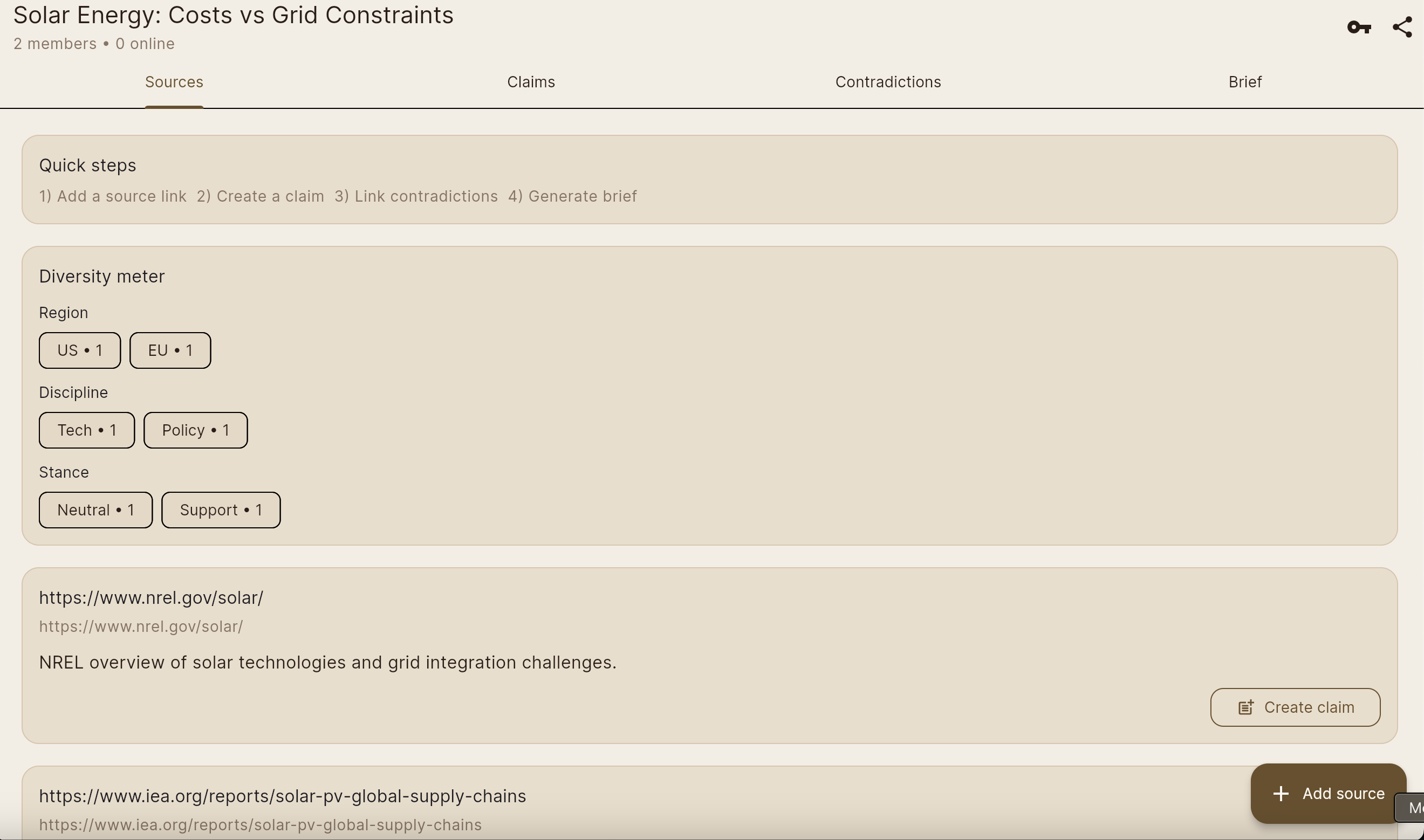 - An end-to-end flow that works: create room → add sources → extract claims → mark contradictions → challenge claims → generate brief → publish report.
